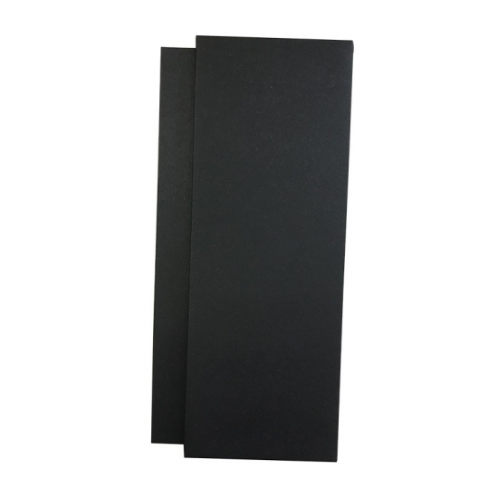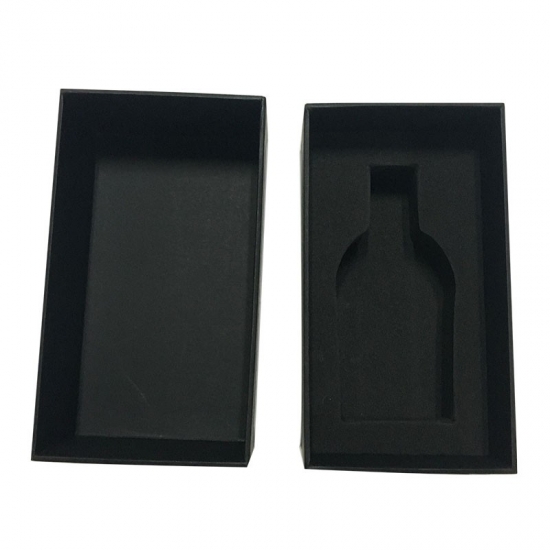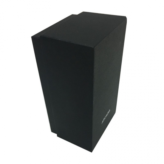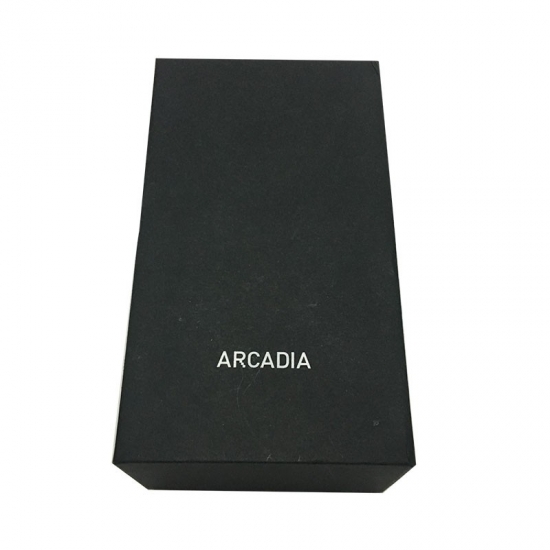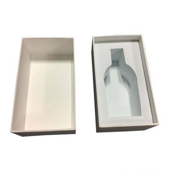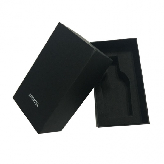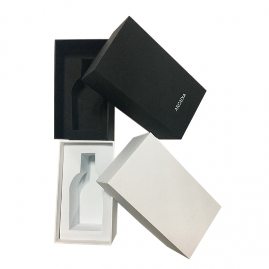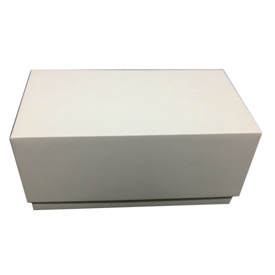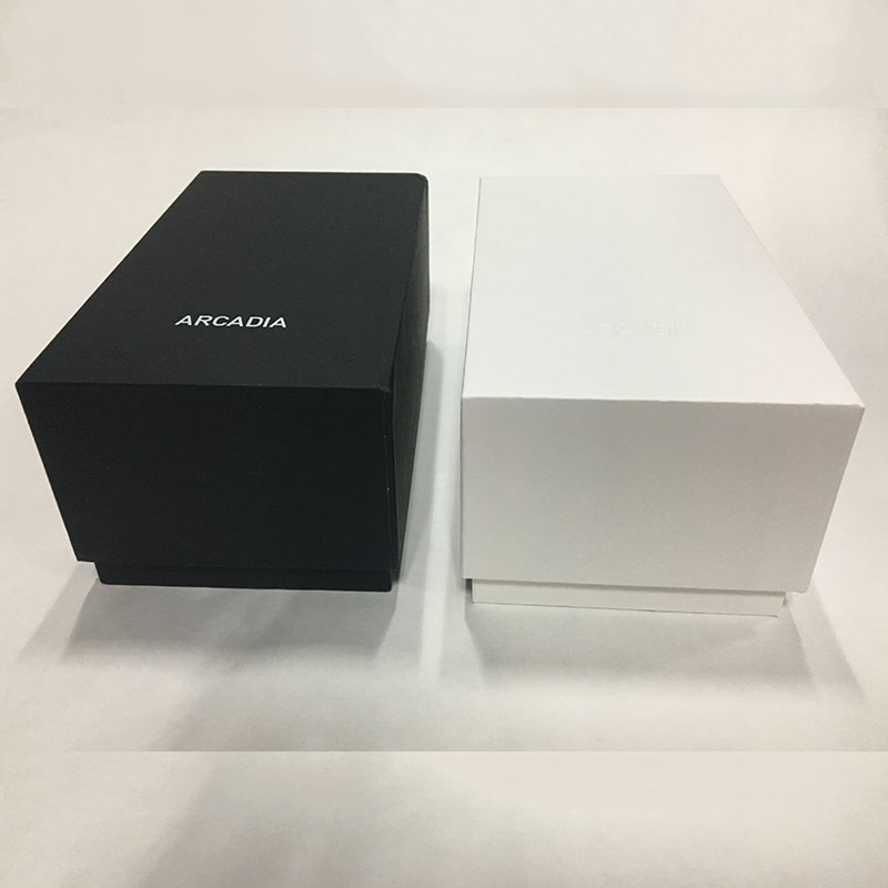 Este es un cajas de regalo con tapas lo cual hizo por papel de arte C2S de 157 g + tablero gris de 1200 g, color blanco con laminado mate y color negro con logotipo estampado en papel blanco en la tapa.