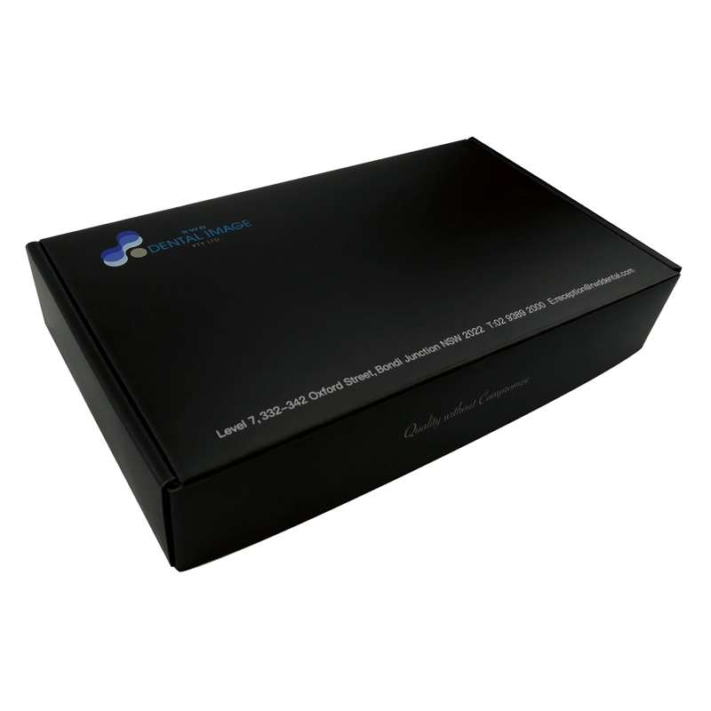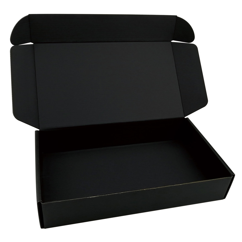 Este es un embalaje de cartón ondulado negro cajas que está hecho con papel flauta CCNB + BE + negro de 250 g, es una caja de correo de estilo simple que por dentro y por fuera es de color negro, impresión de logotipo personalizado en el exterior de la caja con acabado mate.