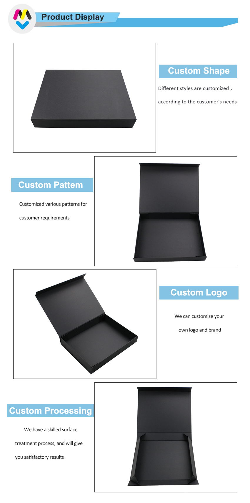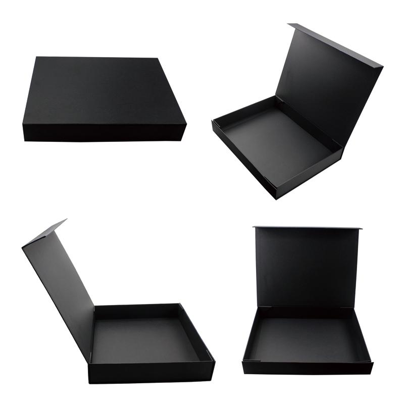 Se trata de cajas plegables pequeñas, planas, simples, negras y ordenadas, de cartón, sin ningún logotipo ni impresión, hechas con cartón especial negro y cartón gris de 2 mm de espesor. Es una caja de embalaje de alto rendimiento y alta calidad.