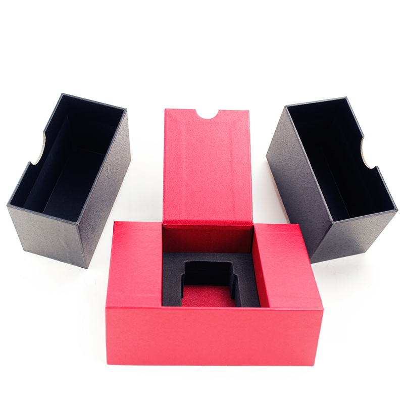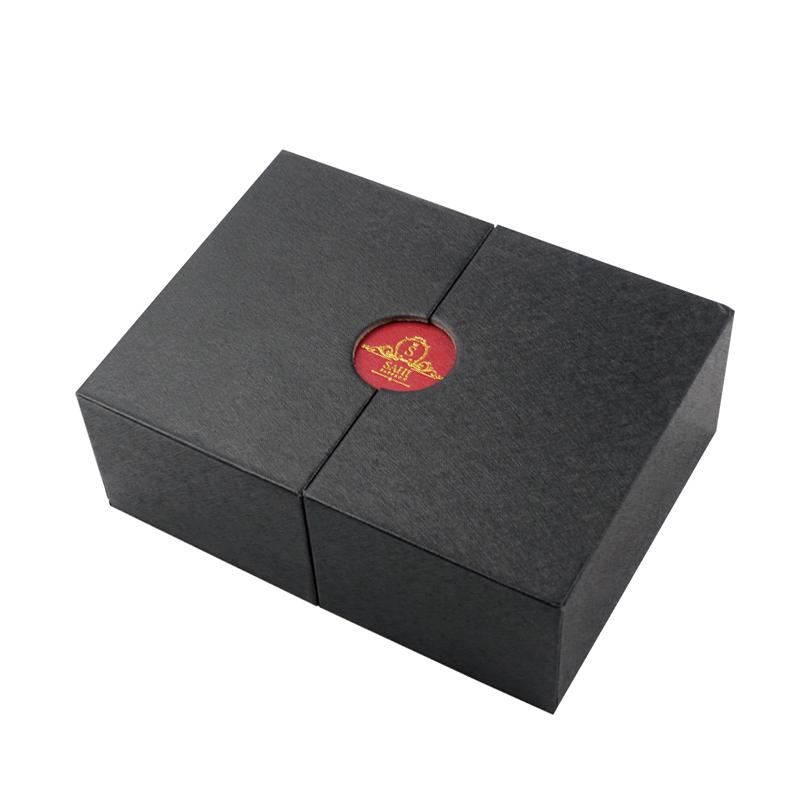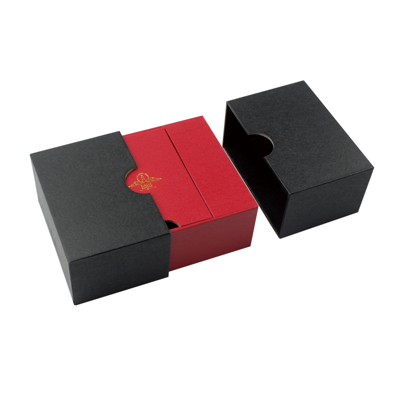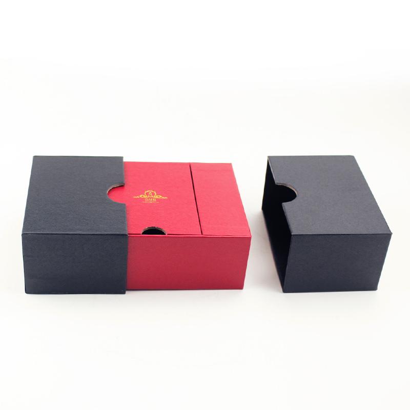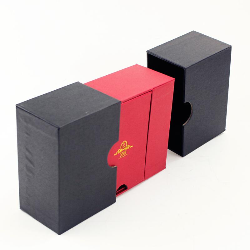 Este es un especial único diseño caja lo cual hizo con papel de textura especial, exterior de la cubierta en negro clásico y caja interior en rojo chino a juego, el logotipo en la tapa con solapa estampado en papel dorado que hace que la caja sea más sofisticada.