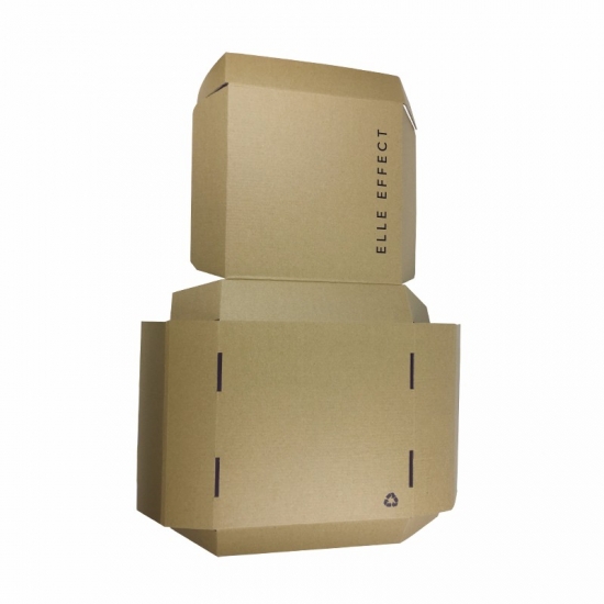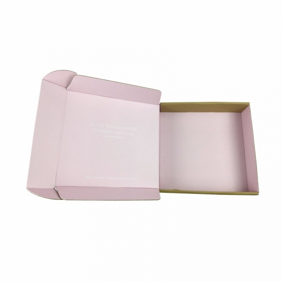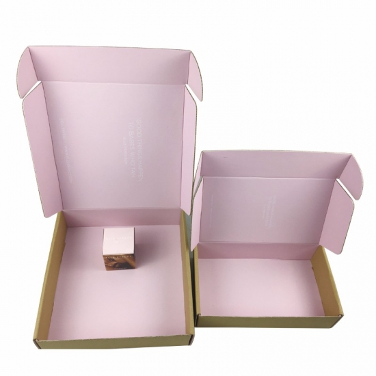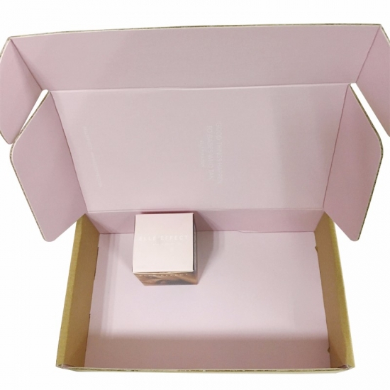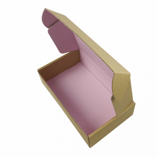 Este es un cajas de correo de almacenamiento de cartón corrugado que fue fabricado por BE flute+ 250 g de CCNB Es una caja postal fácil y sencilla que tiene el exterior en color papel kraft con un logotipo negro personalizado y está llena de color rosa impreso en el interior de la caja.