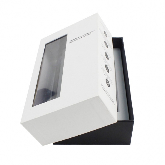 Se trata de una caja de presentación de cartón personalizada con tapa y base con cubierta de PVC transparente hecha de papel de arte C2S de 157 g + cartón gris de 1200 g, el inserto de espuma EVA tiene una forma acorde al tamaño de los productos dentro de la caja.