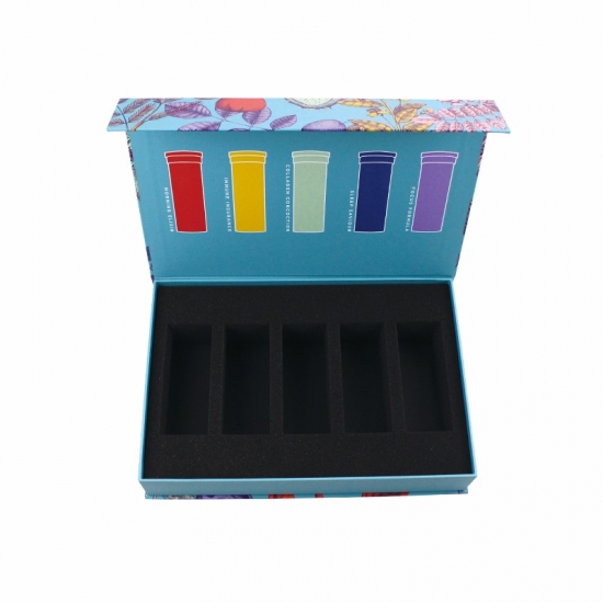 Esta es una caja de regalo personalizada con forma de libro con cierre magnético. lo cual hizo por papel de arte C2S de 157 g + tablero gris de 1200 g, el exterior de la caja tiene un gráfico lleno de colores, el interior de la caja tiene un inserto de esponja troquelada negra que mantendrá los productos en su lugar.