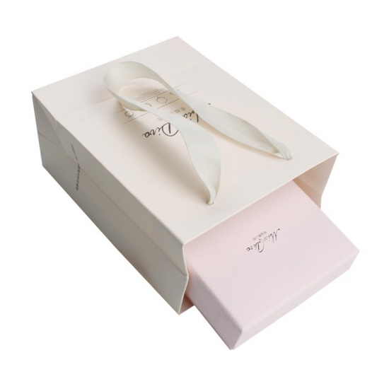 Estas pequeñas bolsas de regalo están impresas en CMYK sobre papel artístico C1S de 250 g/m², con acabado mate y cinta con extremo de plástico. Son un estilo de embalaje popular para regalos promocionales como joyas, cosméticos, zapatos de bebé, etc.