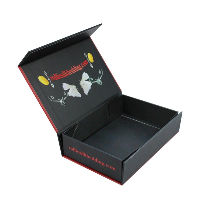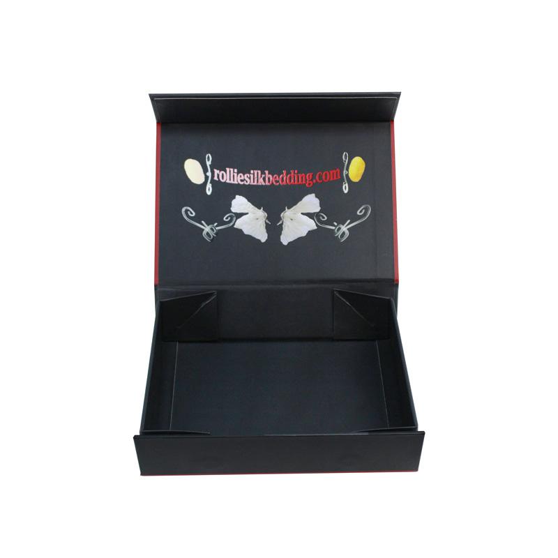 De primera calidad Plegable rígido cajas Fabricado en papel artístico de 157 g/m² laminado con aglomerado gris de 2 mm. Con fondo negro completo y logotipo personalizado impreso en CMYK en la tapa exterior e interior. Su tratamiento especial con barniz UV localizado permite que la marca destaque ante los clientes.