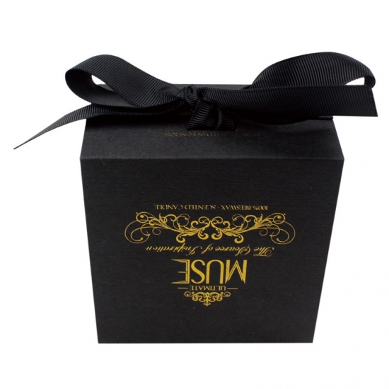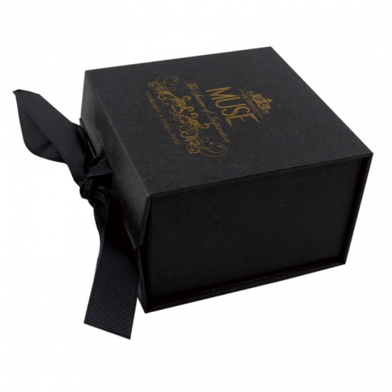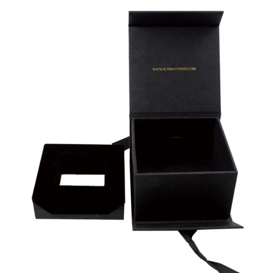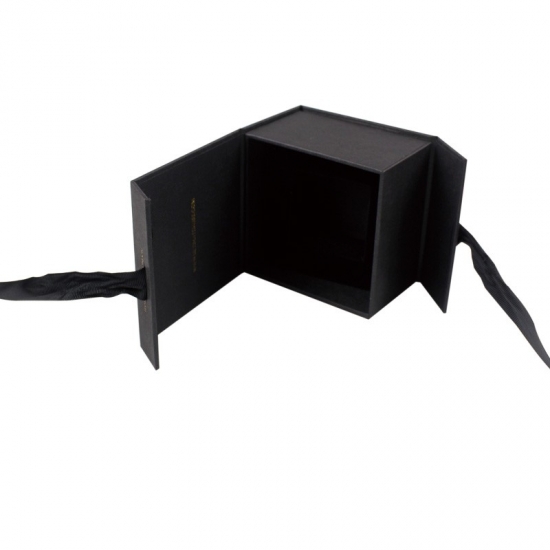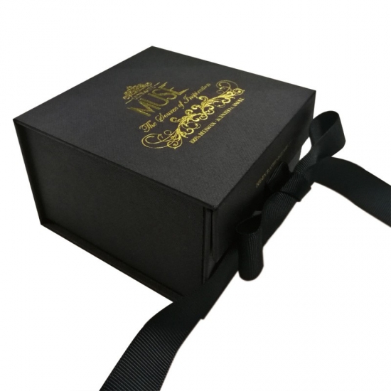 Caja magnética negra con logotipo personalizado y cinta. Cajas decorativas con tapa abatible y cierre magnético.
