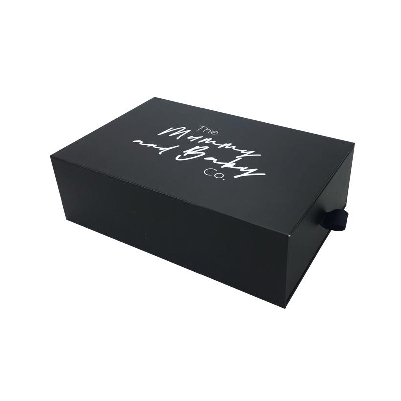Acabado de la caja: CMYK F Impresión en negro completo en todas las cajas con logotipo blanco, laminación de película mate para protección, tirador de cinta negro