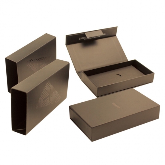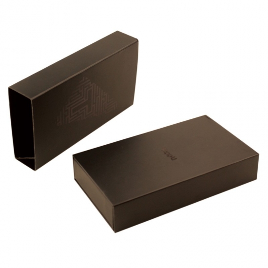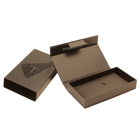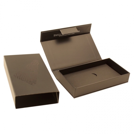 Caja de regalo pequeña con cierre magnético y logotipo personalizado en color negro.
