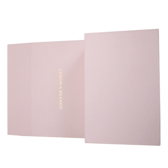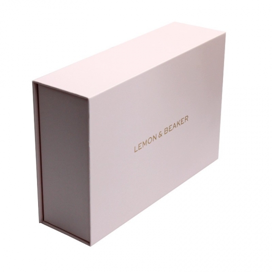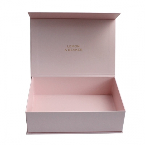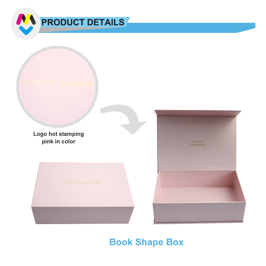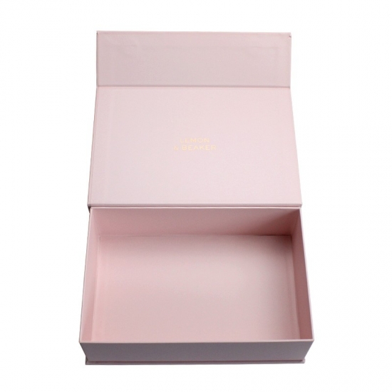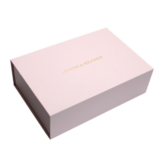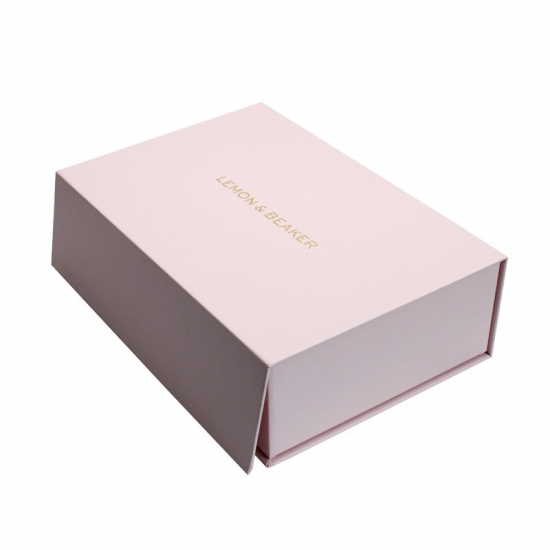 La caja de regalo magnética rosa está hecha con papel artístico C2S de 157 g/m² laminado con cartón gris de 2 mm, laminado mate y estampado en caliente en color rosa.