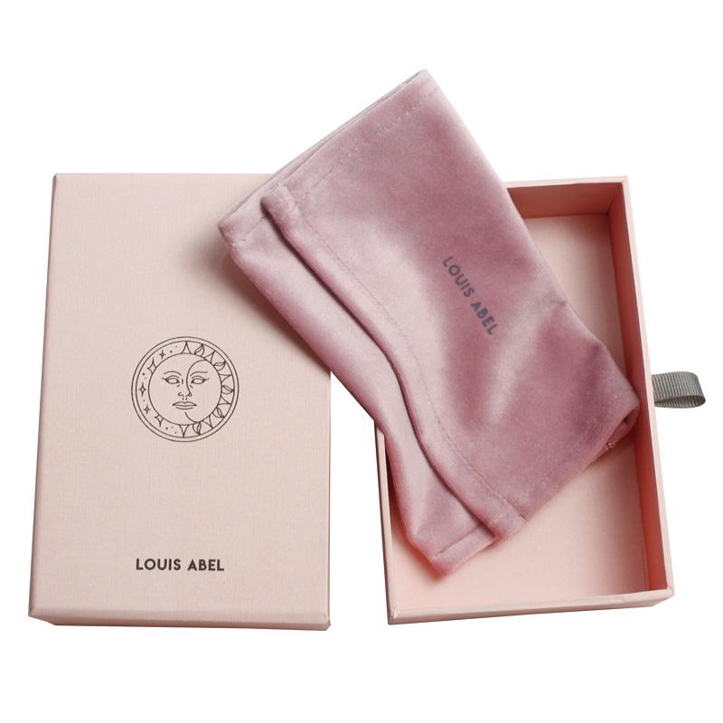 Joyero rosa personalizado con cajón y bolsita, es un tipo de Embalaje de caja de regalo deslizante.