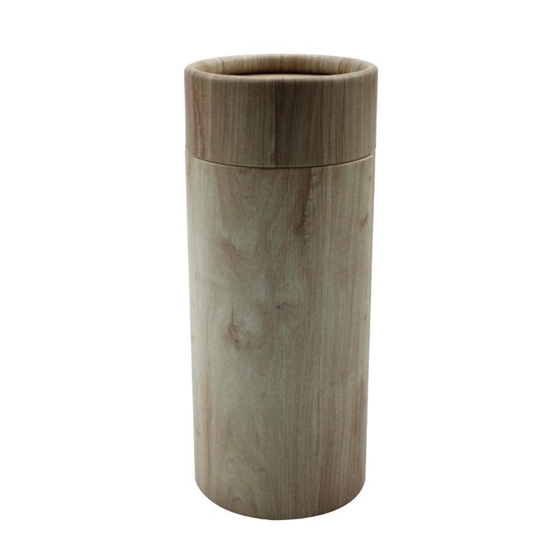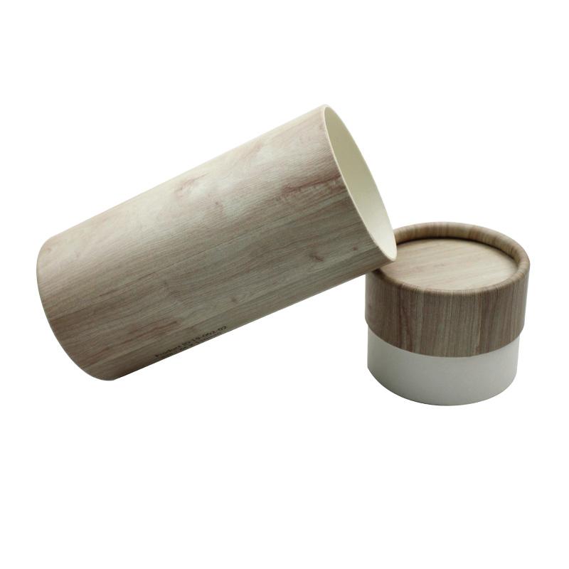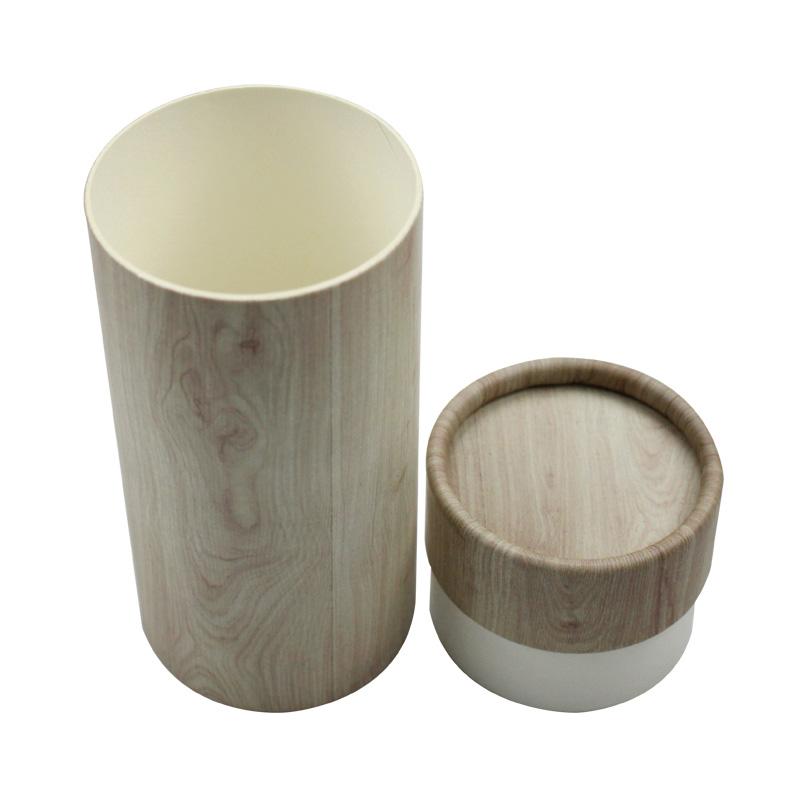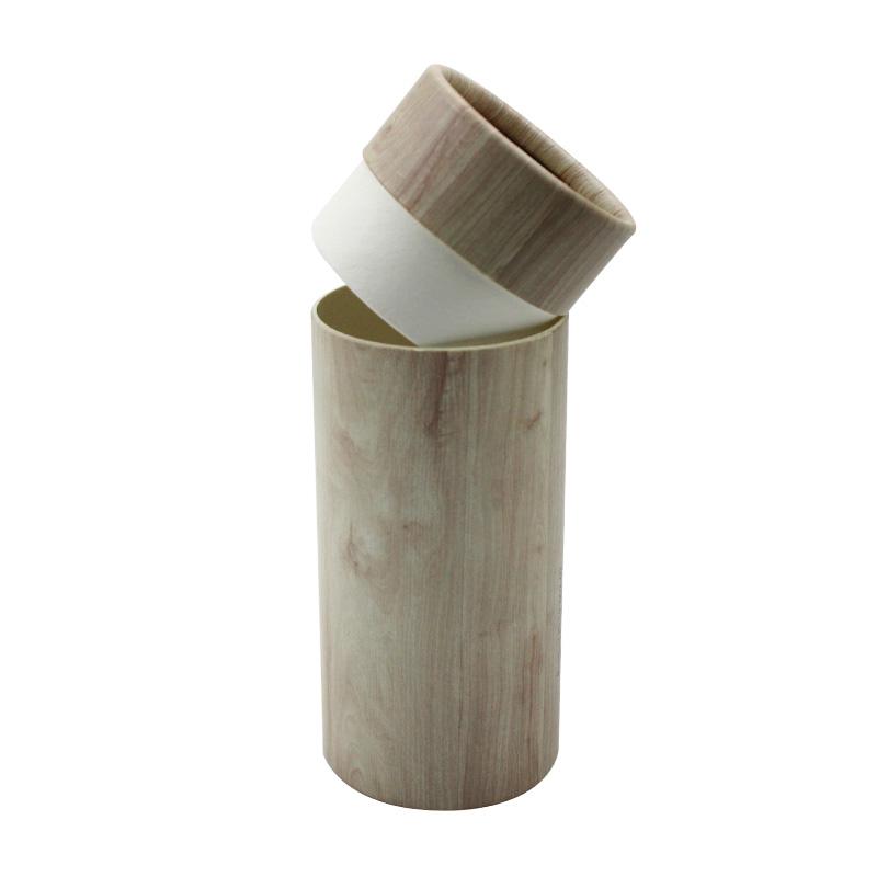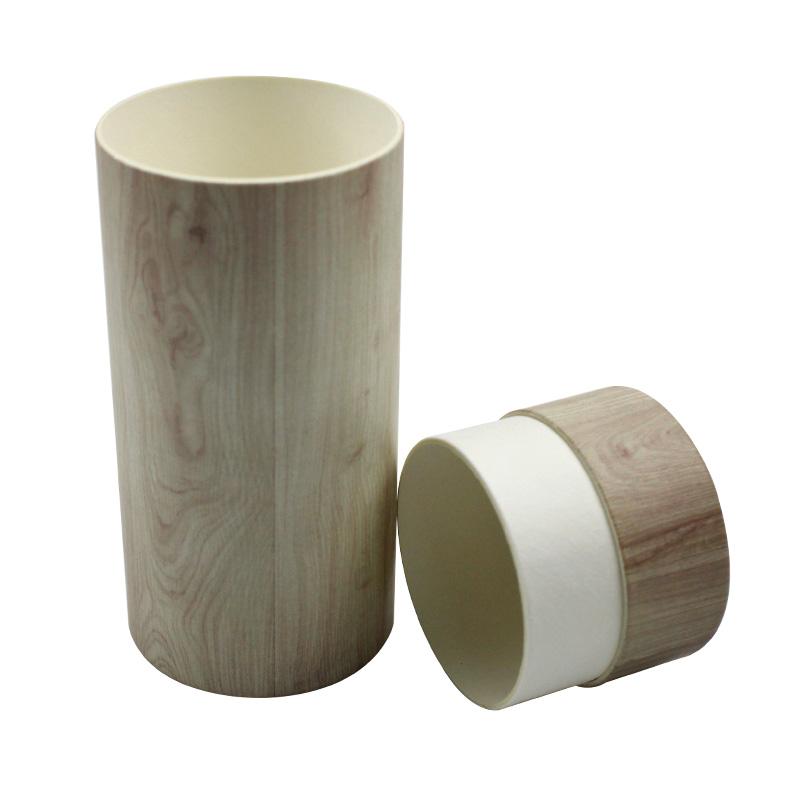 Este es un caja de regalo redonda con tapa Hecho de papel especial con veta de madera. Parece una caja de embalaje de madera de alta gama.