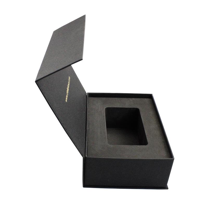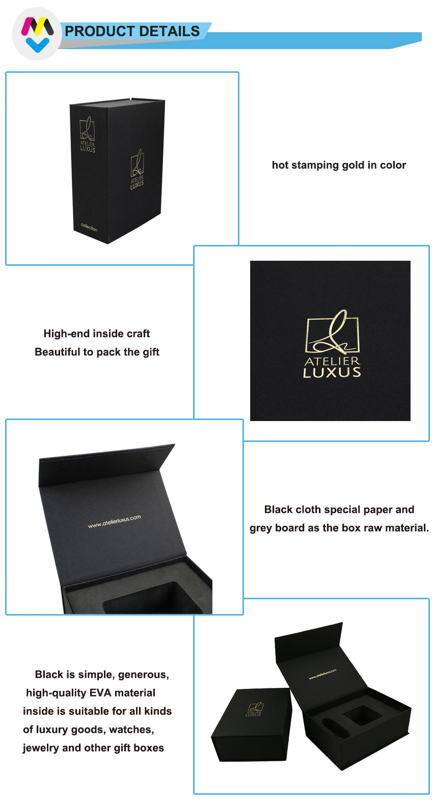 Esta es una caja de regalo hecha de color negro. caja de regalo con solapa magnética Papel de cartón ecológico, con espuma EVA de alta calidad para proteger su producto de daños.