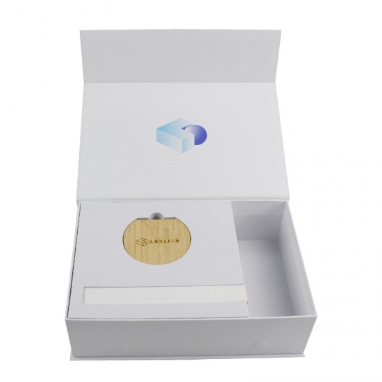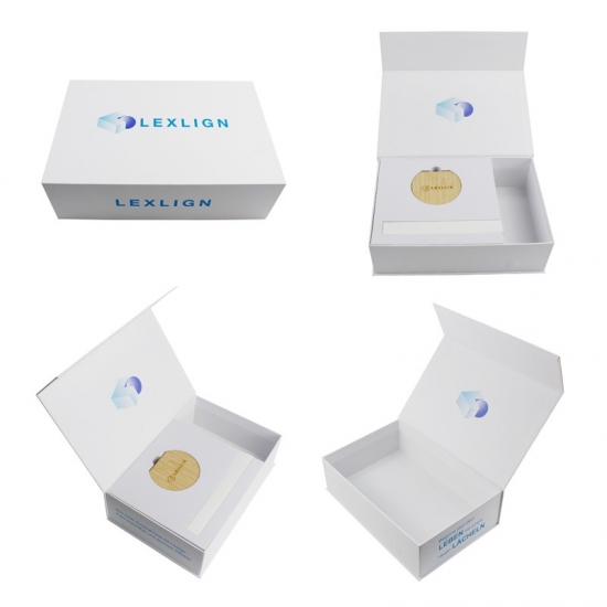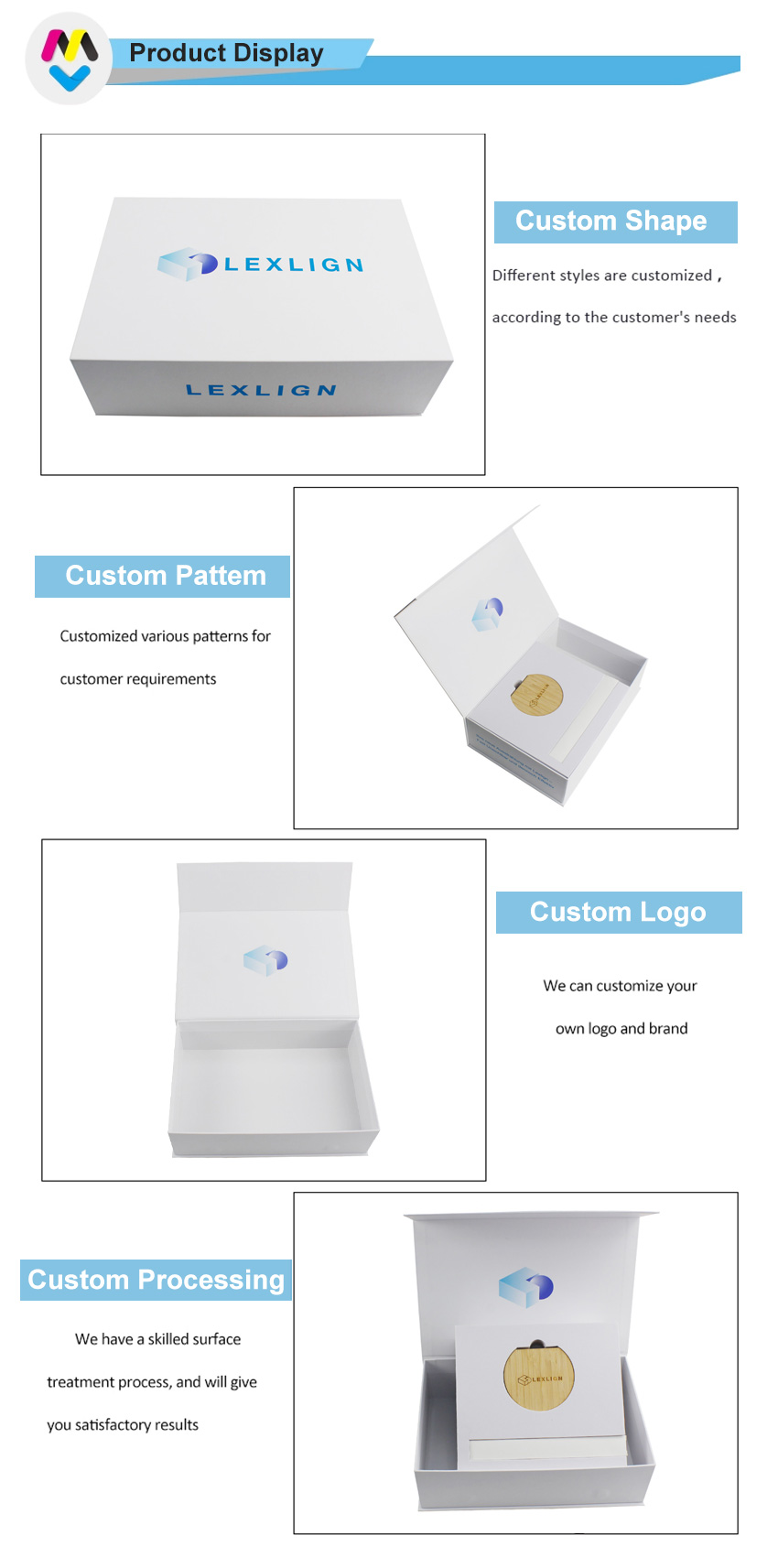 La caja magnética blanca está hecha con papel artístico C2S de 157 g/m² laminado con cartón gris de 2 mm. La bandeja interior es de espuma EVA de alta calidad. Cualquier soporte interior se puede personalizar, laminación mate e impresión CMKY.