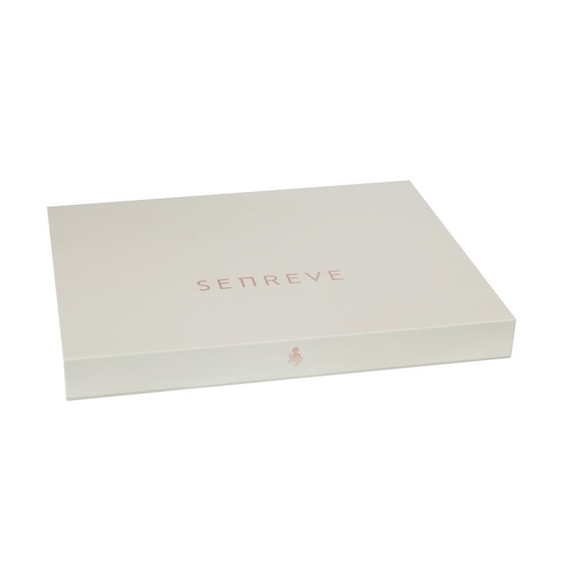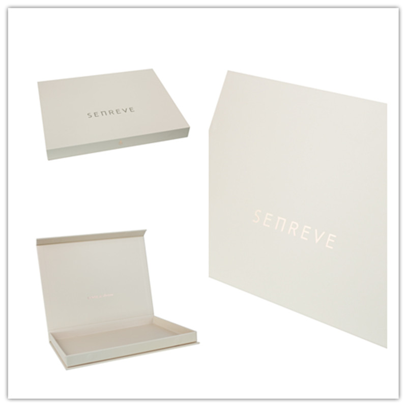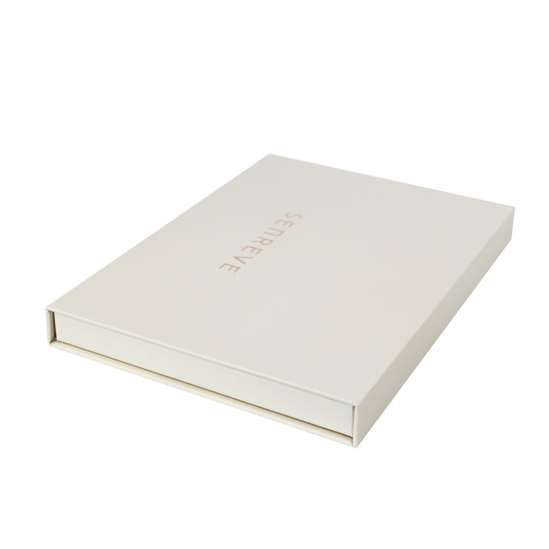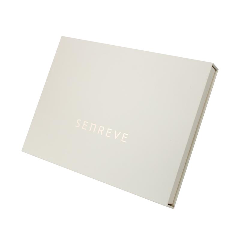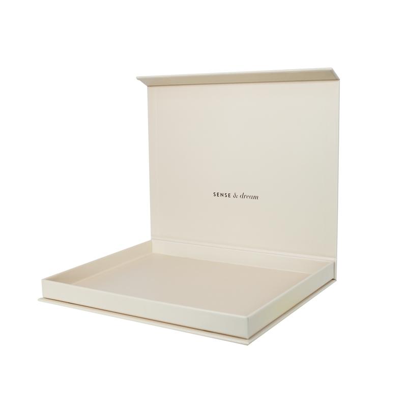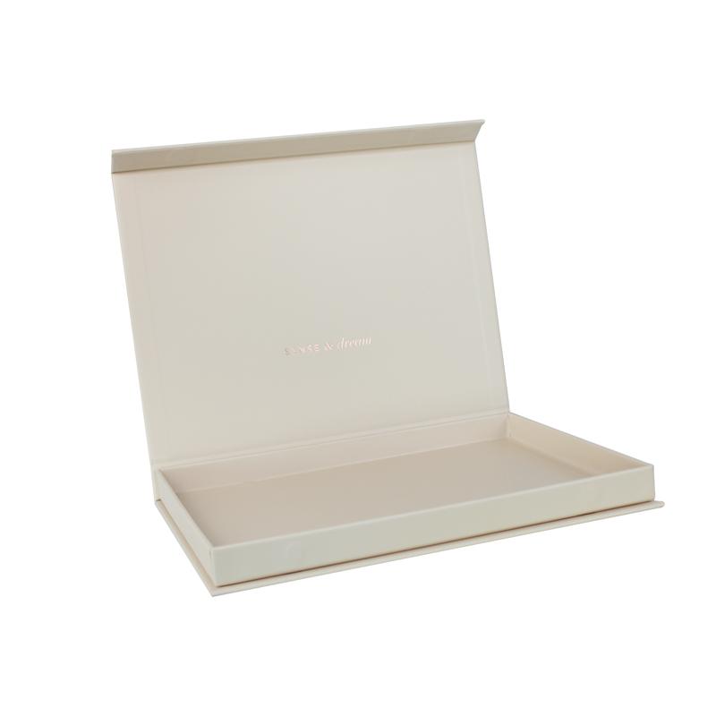 Este Caja de regalo con forma de libro Está fabricado con papel artístico de 157 g/m² laminado con cartón gris premium de 2 mm y cuenta con un potente cierre magnético. El logotipo está estampado en caliente con lámina de oro rosa claro. Sencillo pero clásico.
