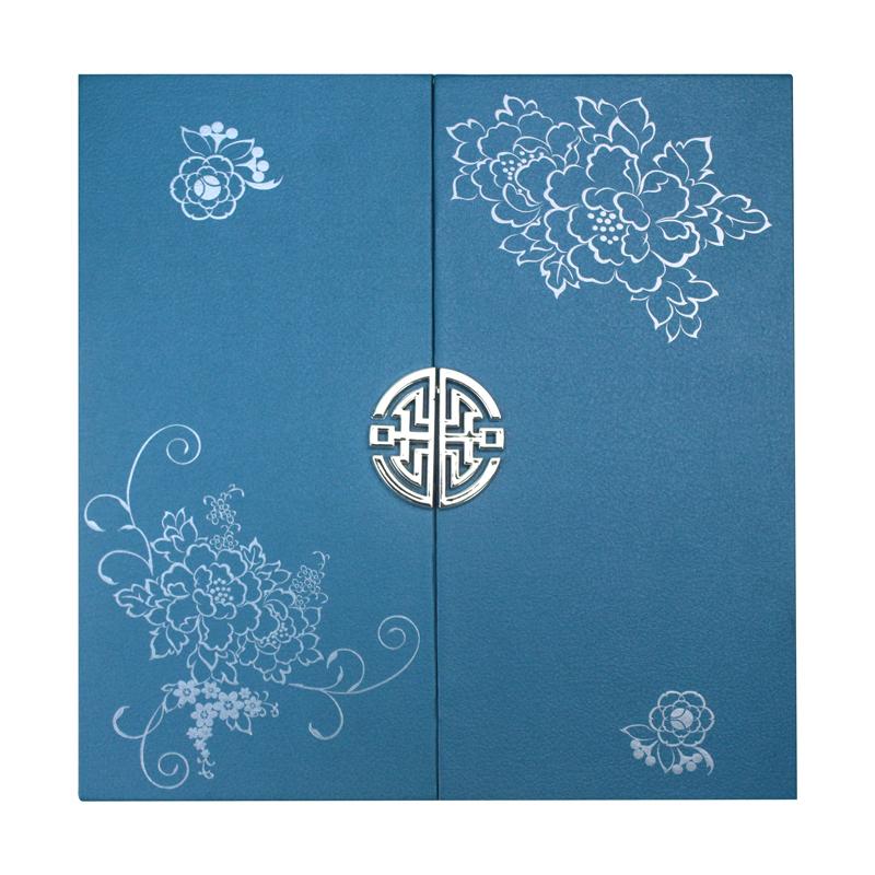 Acabado de la caja: Impresión en azul Pantone, laminado con película mate, relieve, estampado en caliente con lámina dorada,