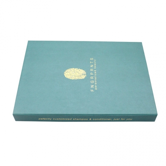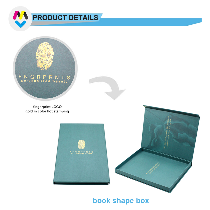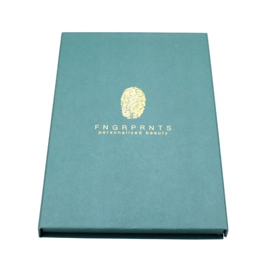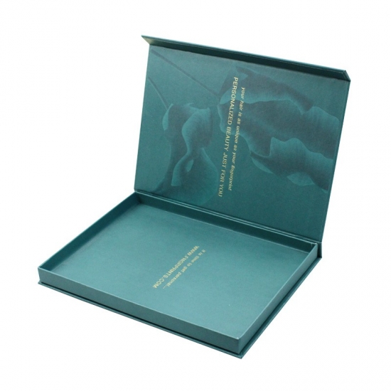 La caja magnética de cartón verde fue hecha con papel de arte C2S de 157 g/m² laminado con cartón gris de 2 mm. Admite personalización de cualquier tamaño, color y logotipo, el acabado de la superficie fue laminado mate, impresión CMYK con estampado en caliente dorado. Tamaño 22,3*16*2 cm