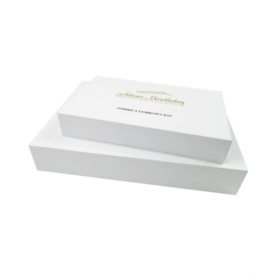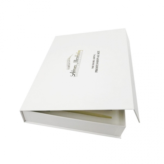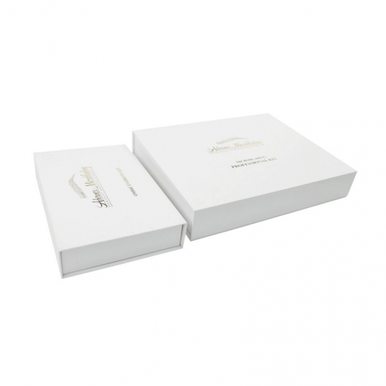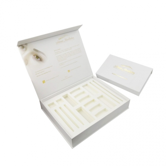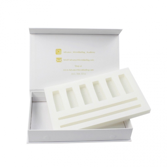 La caja magnética con tapa blanca y estampado en caliente está hecha de papel artístico C2S de 157 g/m² laminado con cartón gris de 2 mm. El interior es de espuma de esponja personalizada en cualquier tamaño, color y logotipo. El acabado de la superficie fue laminado mate, estampado en caliente dorado de tamaño 24*15,5*4 cm.