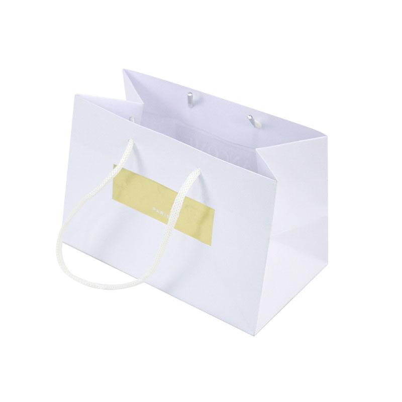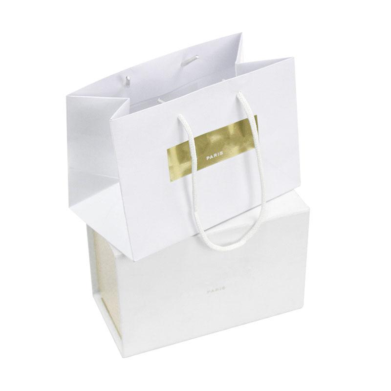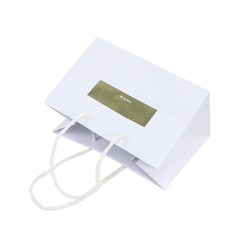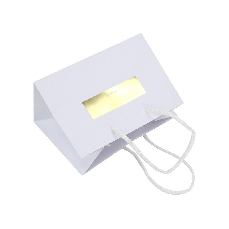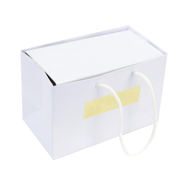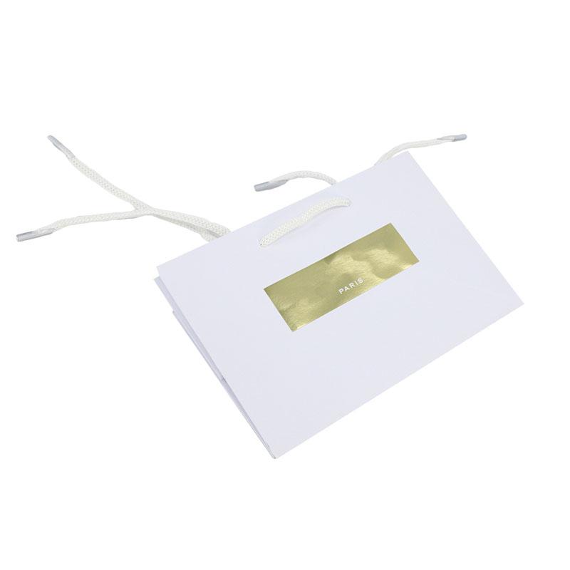 Material de la bolsa: cartón blanco de 250 g/m² + asa de cuerda blanca con extremo de plástico