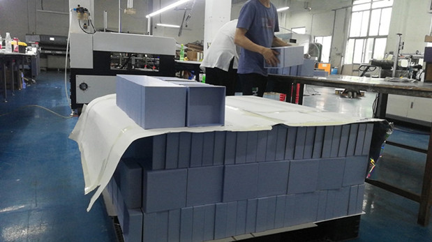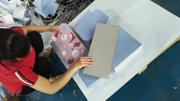 Tras la impresión y la protección con film, el papel se troquelará según la estructura de la caja. Con ayuda de una máquina, nuestros artesanos expertos montaron el papel con cartón rígido de primera calidad.