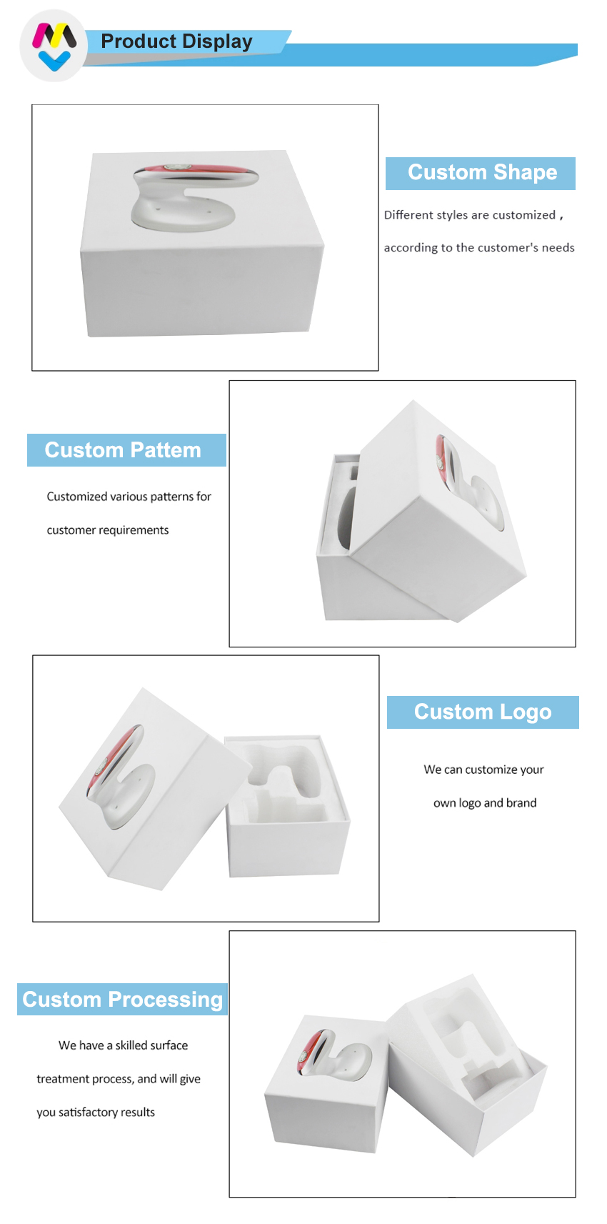 Este es un caja superior e inferior lo cual hizo con papel de arte C2S de 157 g + tablero gris de 1200 g, hay espuma de PE blanca de buena calidad en la parte inferior interior de la caja. El instrumento facial puede encajar perfectamente dentro de la espuma de PE.