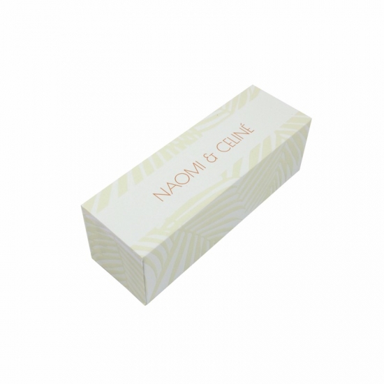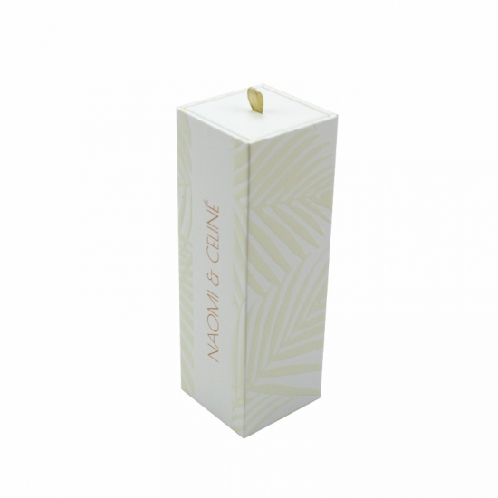 Hojas de color amarillo pálido con superficie en forma de arte y logotipo de lámina de texto rojo, caja de cosméticos y cuidado de la piel de diseño personalizado muy delicado con cajón. Fabricada con papel de arte de 157 g + tablero gris, estampado de hojas en relieve + laminado mate con tirador de cinta.