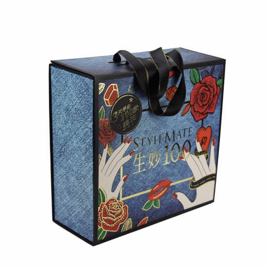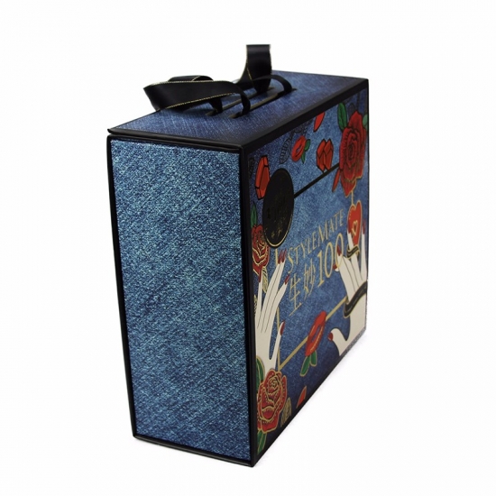 Caja plegable con diseño exclusivo personalizado de patrón de mezclilla con asa de cuerda de cinta de grosgrain, laminado mate, estampado de lámina dorada y tapa troquelada.
