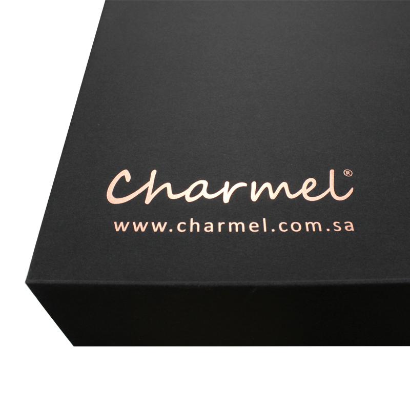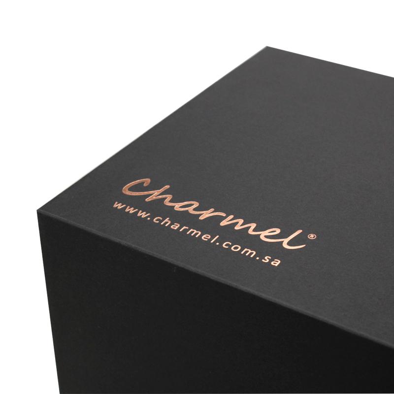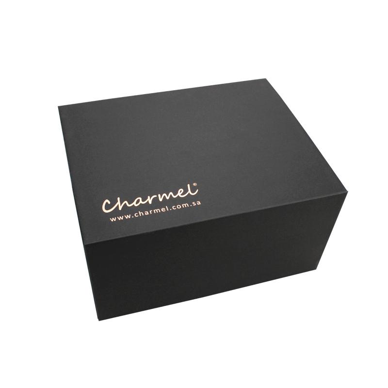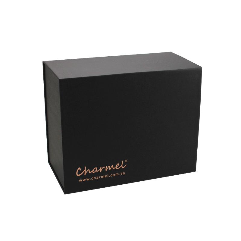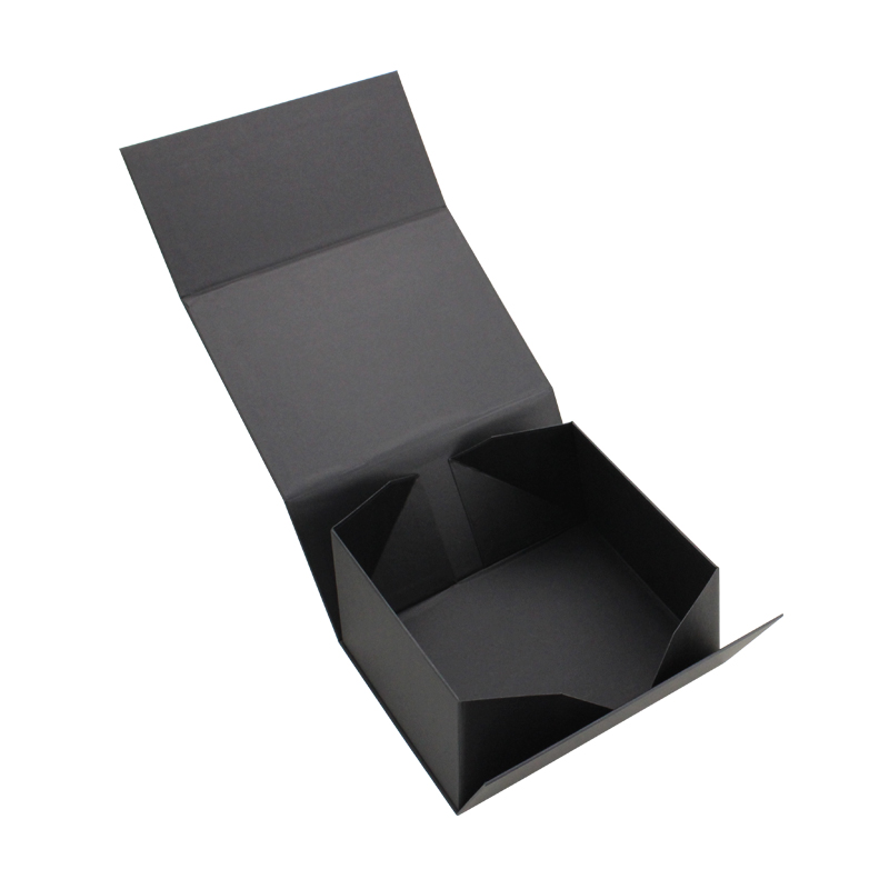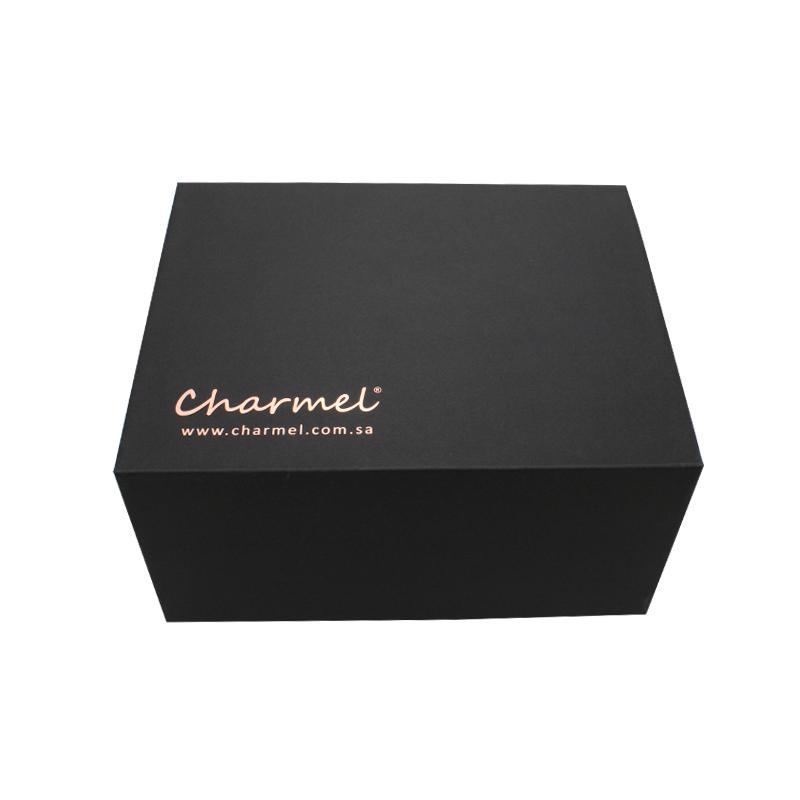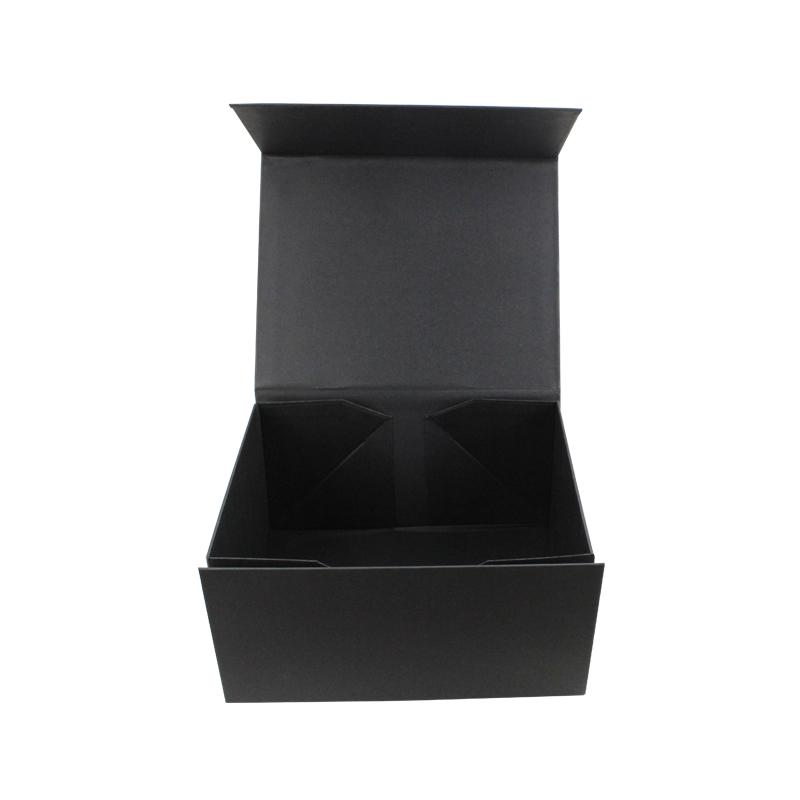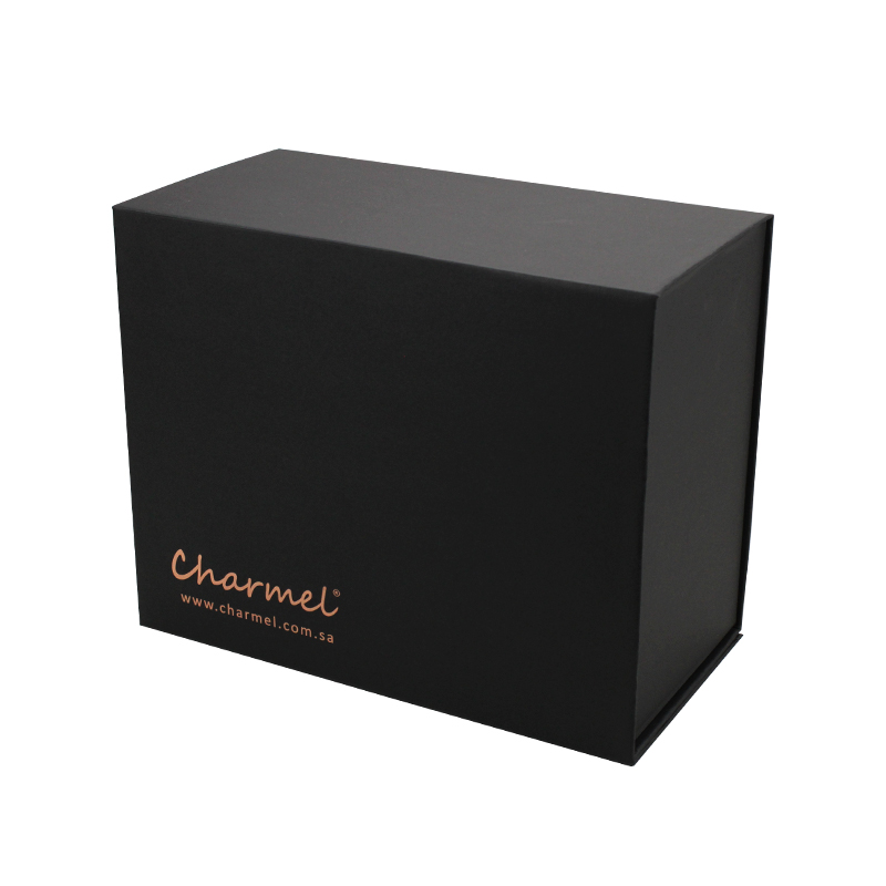 Este es un negro cajas de embalaje magnéticas plegables lo cual hizo con papel negro especial + cartón gris de 1200 g, el logotipo en la esquina de la tapa superior está estampado en papel de oro rosa. Podemos personalizar el tamaño y el logotipo según su solicitud.