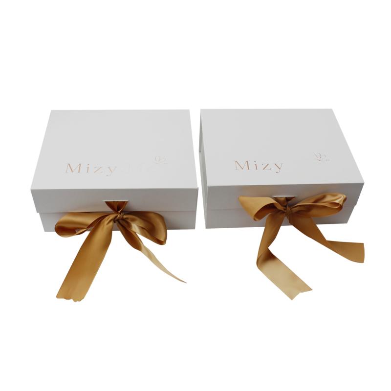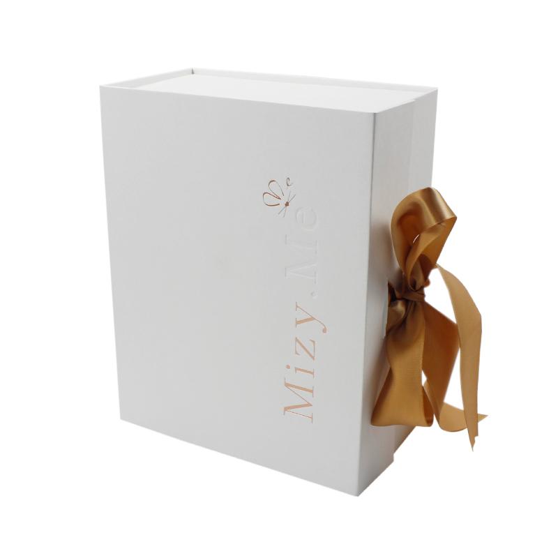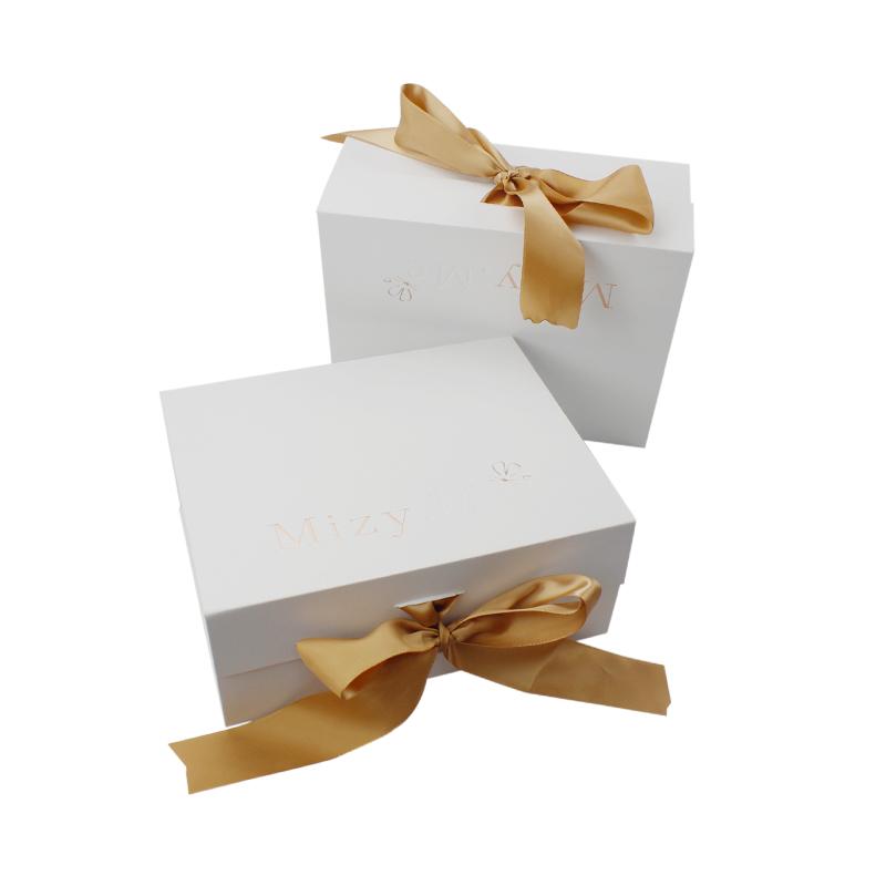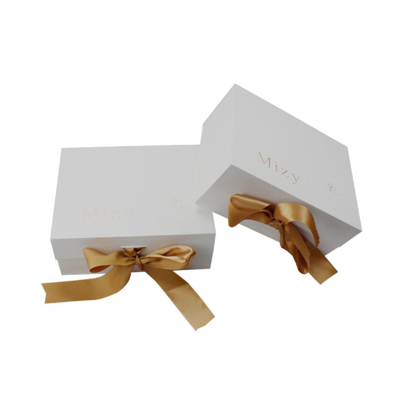 Este es un cajas de regalo magnéticas blancas lo cual hizo por papel especial + cartón gris de 1200 g, logotipo estampado en papel dorado + grabado en relieve en el exterior de la caja y el cierre de cinta adjunto coincide con el color del logotipo, blanco liso sin impresión dentro de la caja. Podríamos personalizar el tamaño según su solicitud.