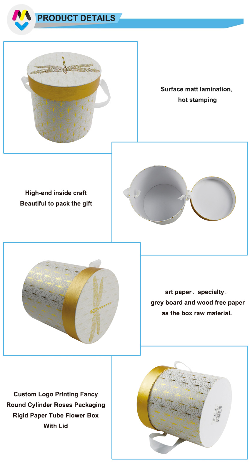 Esta es una gran caja de regalo redonda con hermosos patrones decorativos en la parte superior e inferior hecha de papel de arte C2S de 157 g + cartón gris de 1200 g, el LOGOTIPO de la libélula está en la tapa para que la caja parezca realista y con un asa de cinta que es fácil de quitar.