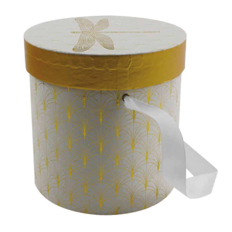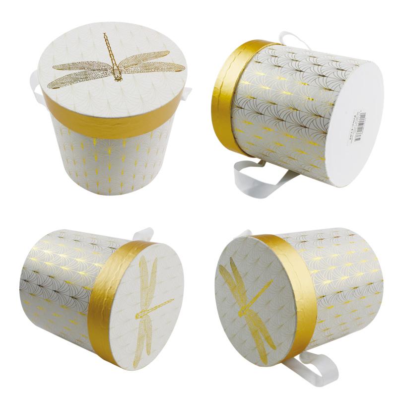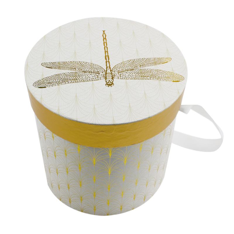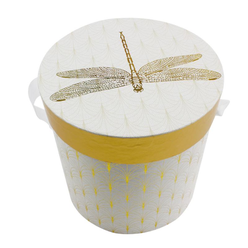 Caja de regalo redonda grande con patrón decorativo hermoso personalizado con tapa, el logotipo de la libélula está en la tapa para hacer que la caja parezca realista.