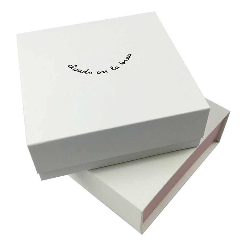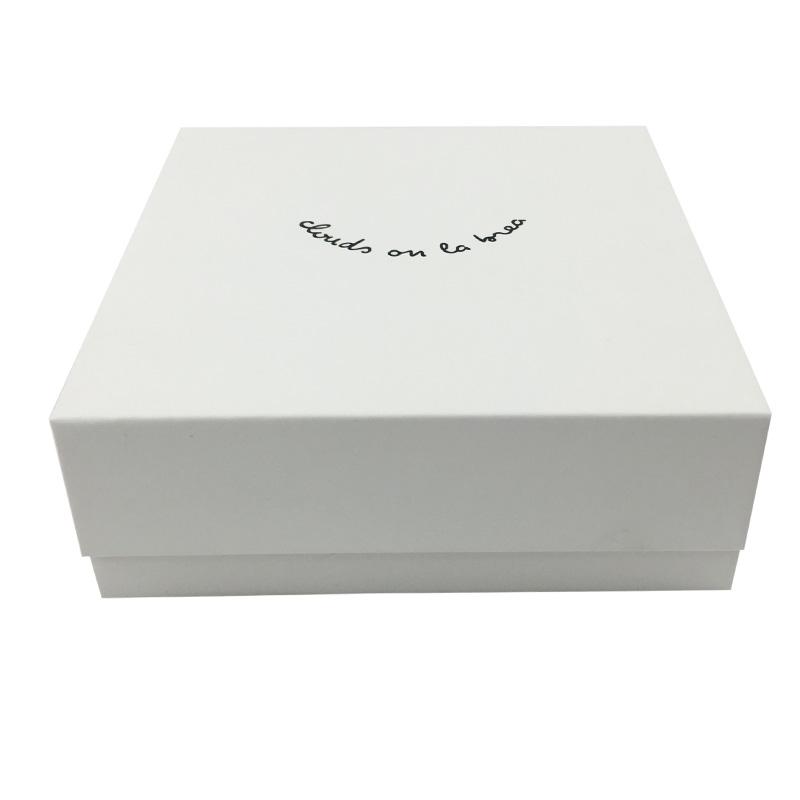 Esta caja de regalo rígida con media tapa es elegante, impresa en color blanco con un logotipo personalizado para embalar ropa y otros.