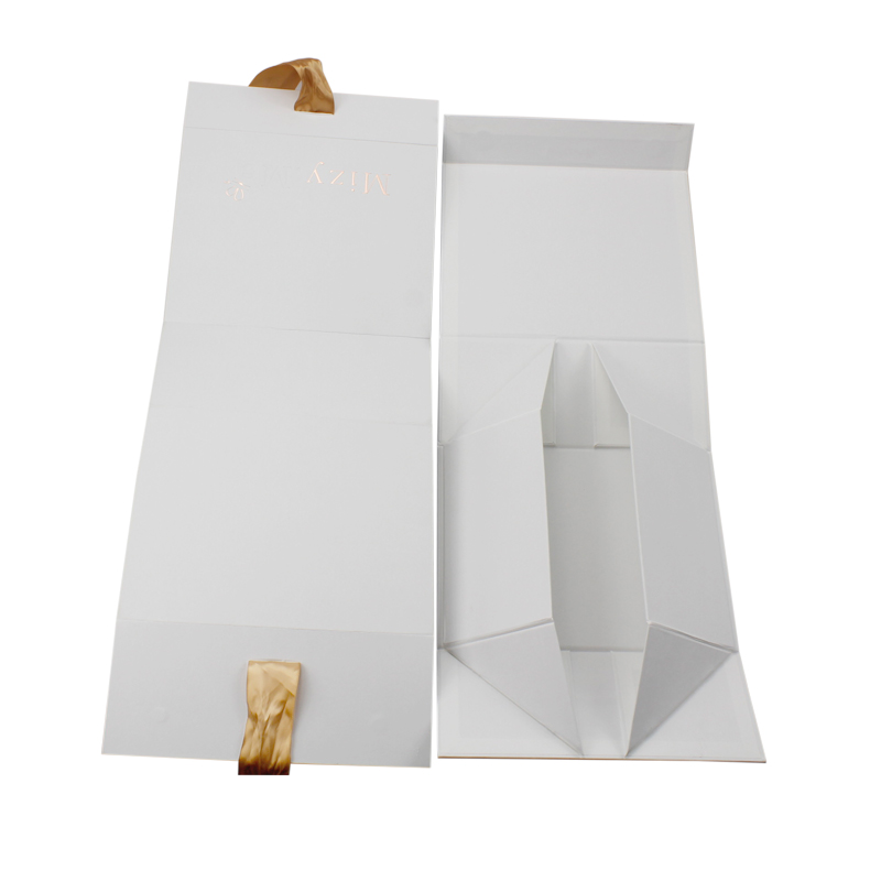 Caja de regalo plegable de lujo con cinta blanca y papel magnético.