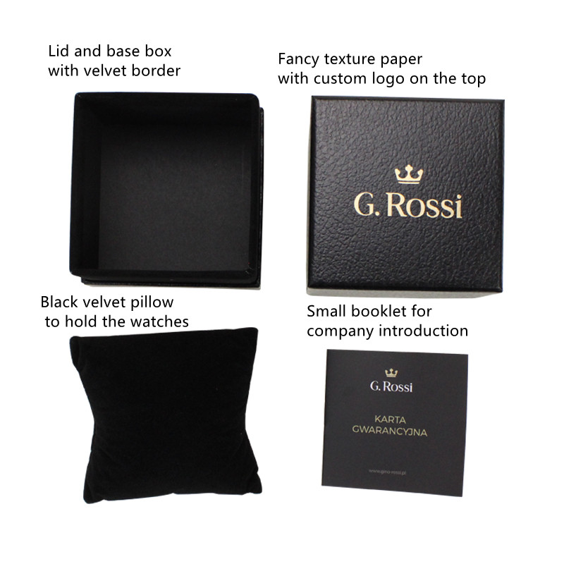 5. Accesorios: Almohada de terciopelo negro para guardar los relojes, con un pequeño folleto que imprimimos