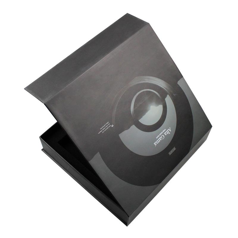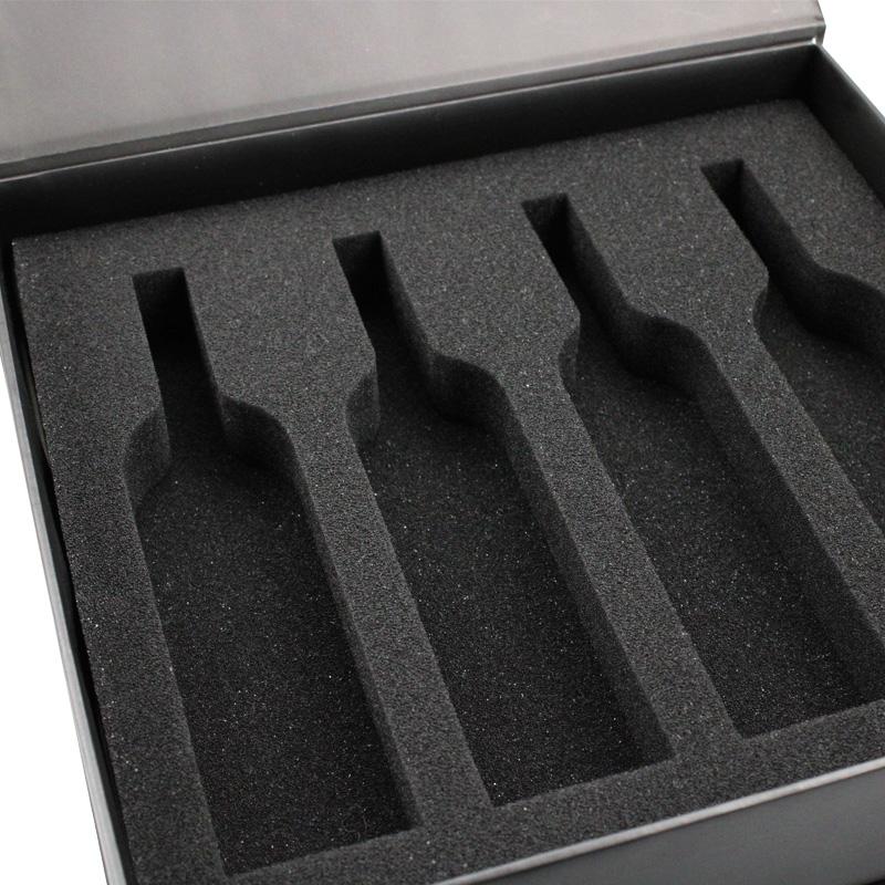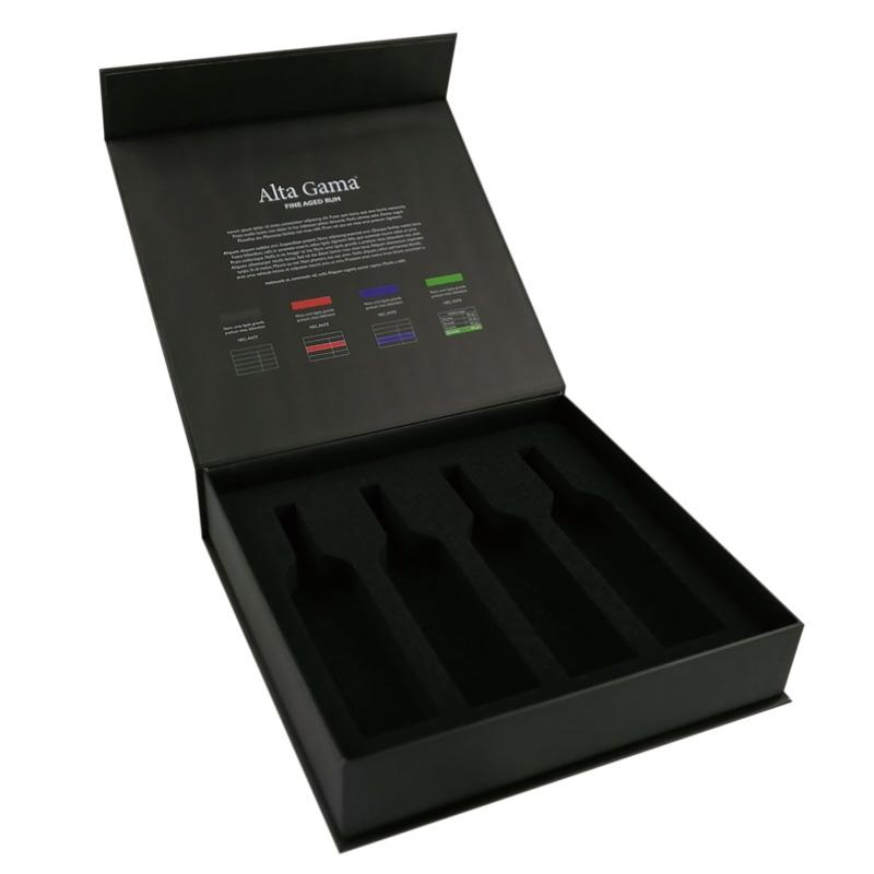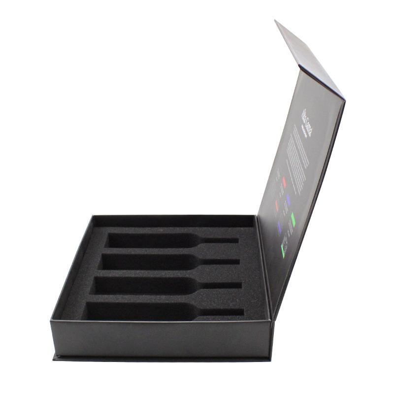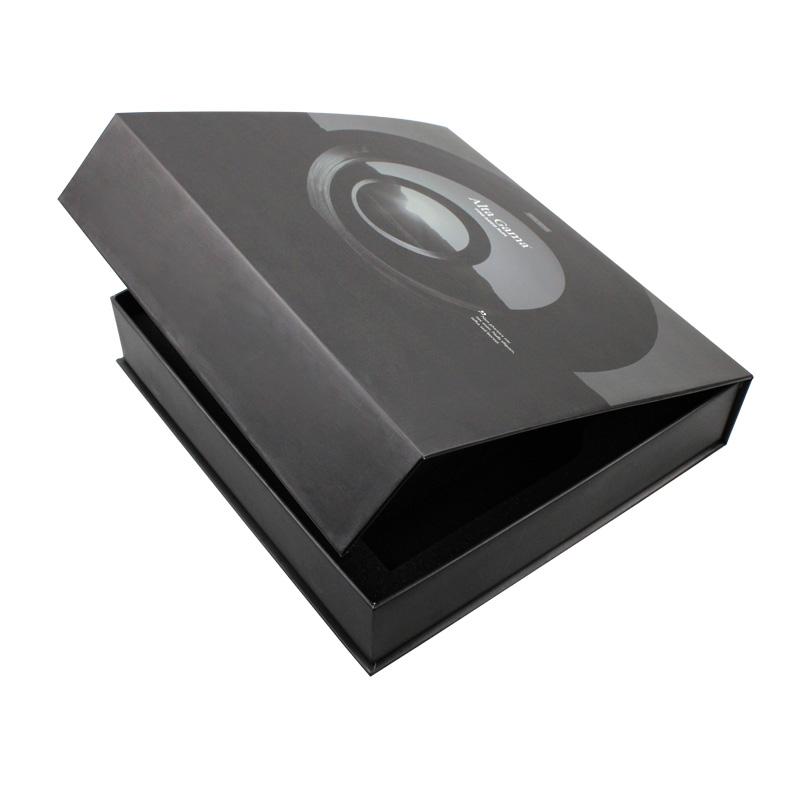 Este es un libro negro en forma de caja de embalaje magnética Con un inserto de esponja que se puede cortar según el tamaño de su producto.
