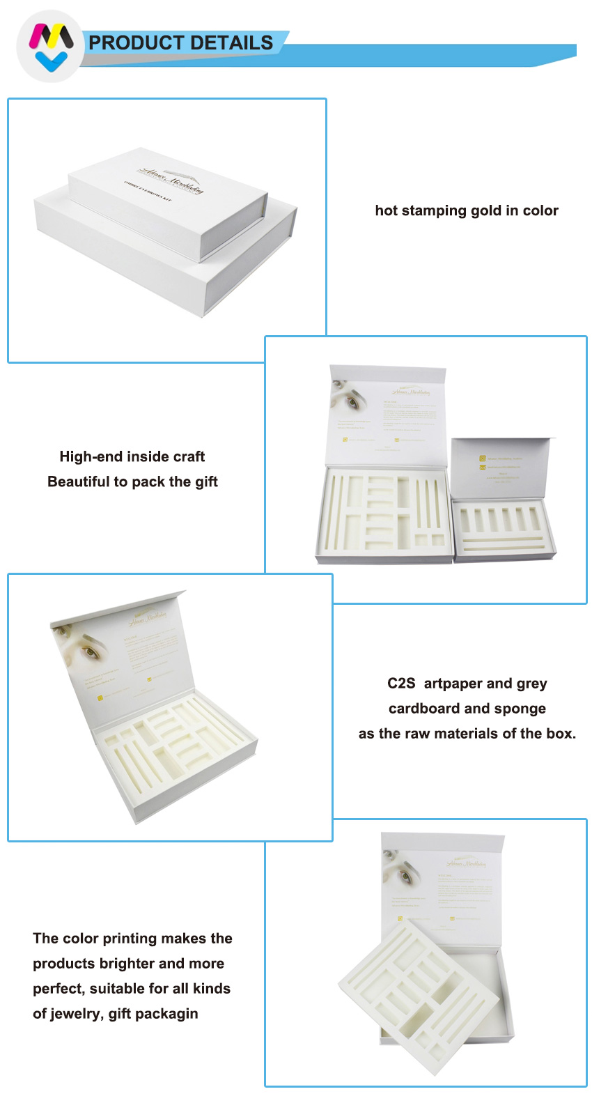 Este es un caja de embalaje con divisores lo cual hizo por papel de arte C2S de 157 g + tablero gris de 2 mm, el logotipo en la parte superior de la caja es un estampado de láminas de colores mezclados que podría hacer que la caja se vea brillante y lujosa, el interior del relleno de la caja es una esponja blanca de forma personalizada con terciopelo.
