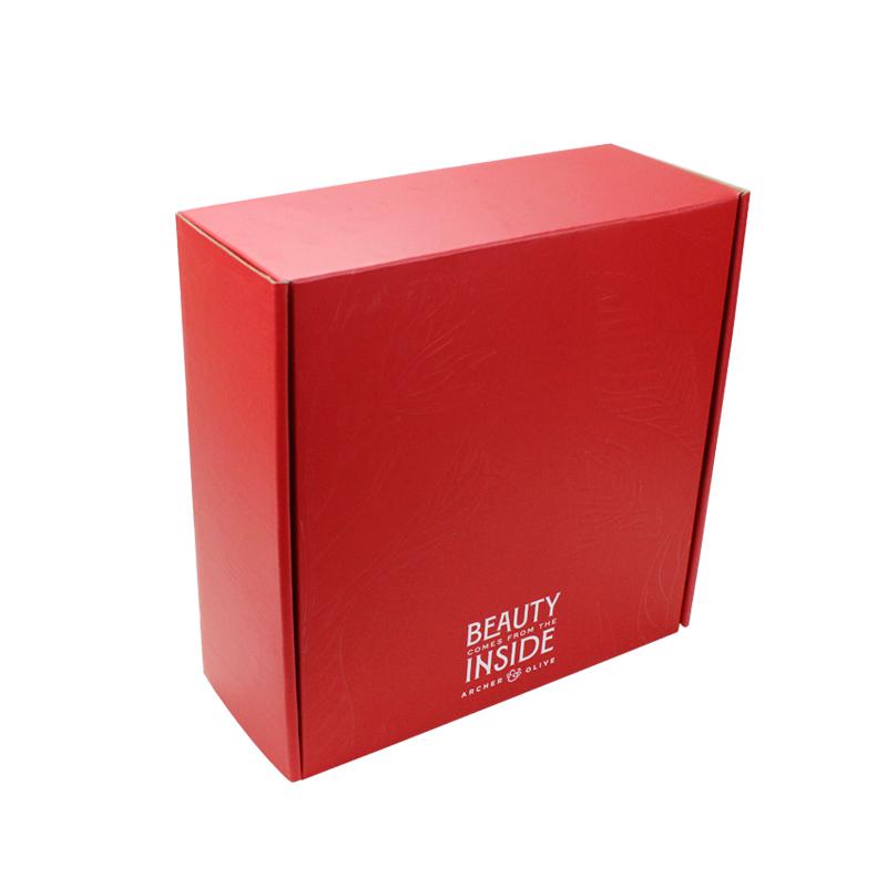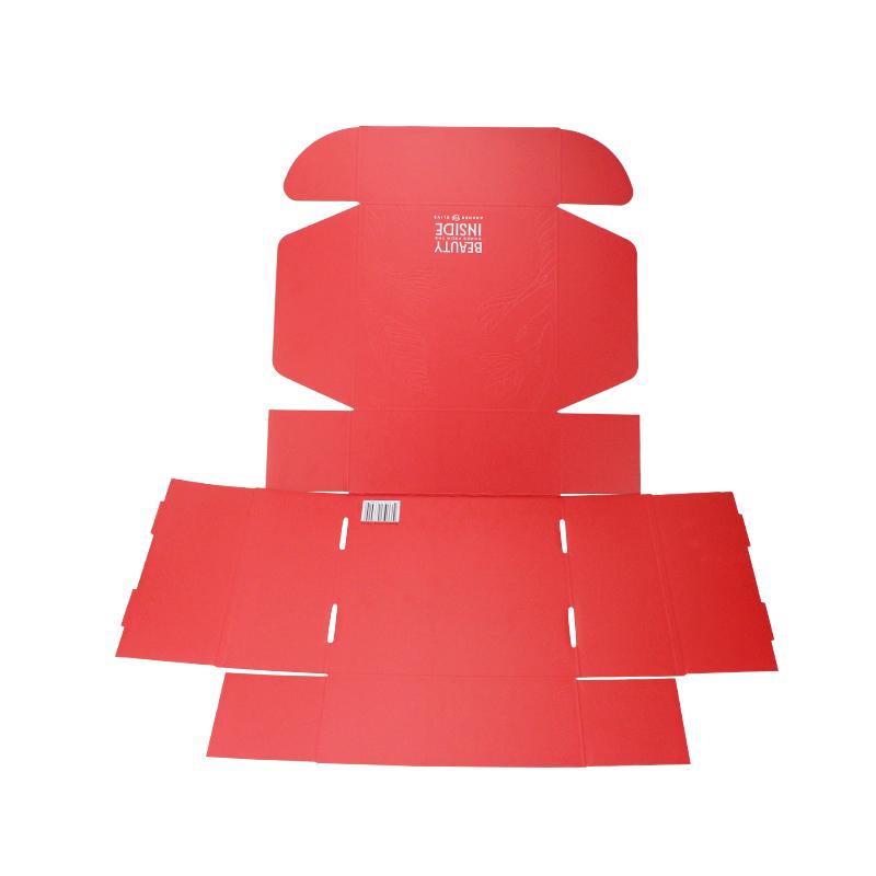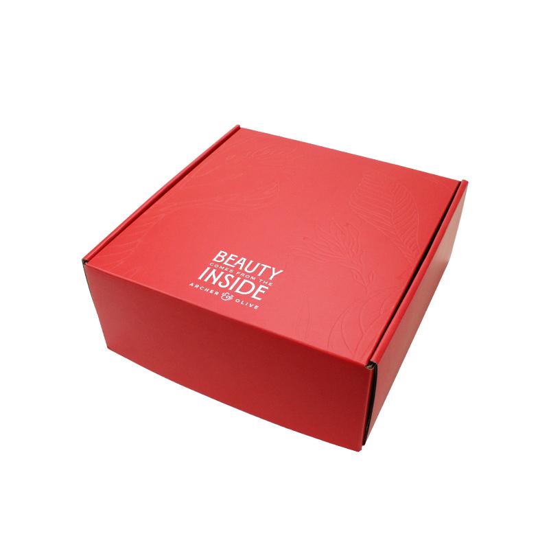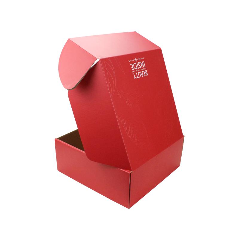 Este es un cajas de cartón corrugado de gran tamaño que está hecho con flauta CCNB + BE de 300 g, es una caja de correo de gran tamaño pero muy elegante y especial que tiene un logotipo blanco en el exterior sobre una superficie completamente roja, con un patrón en relieve como una hoja, y un color kraft liso en el interior.