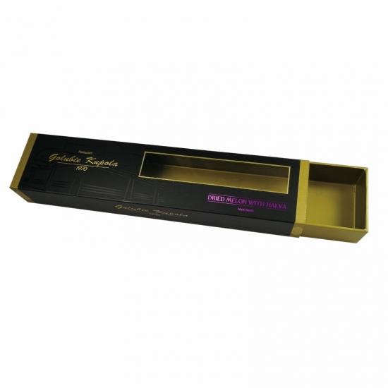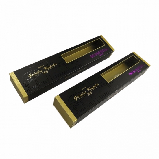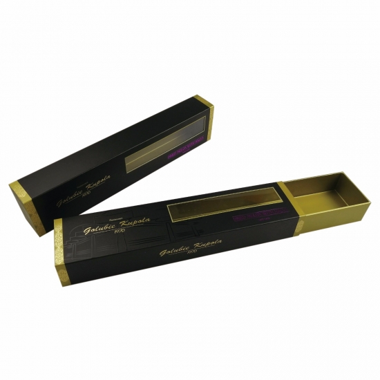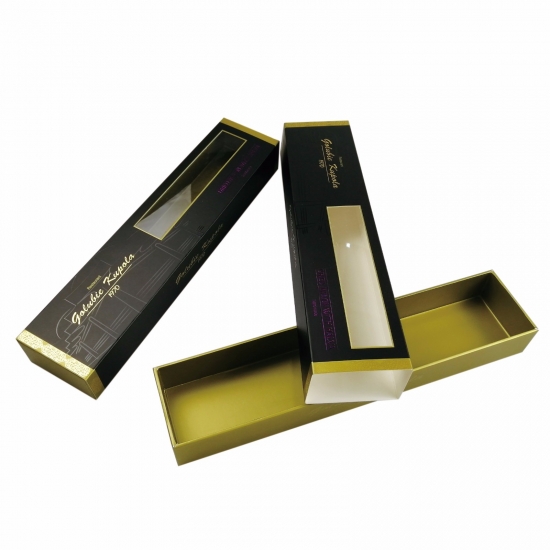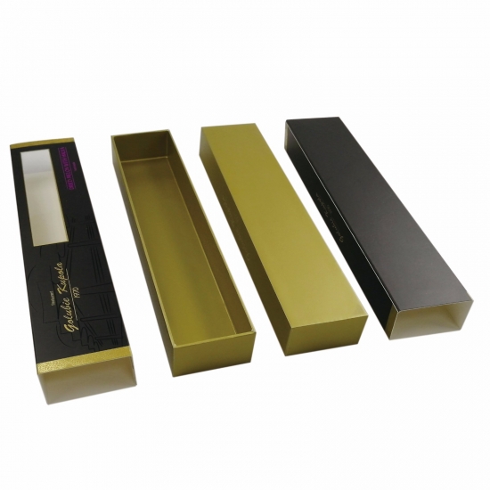 Caja de cajón de papel con ventana de PVC transparente abierta, estampado en caliente multicolor y revestimiento UV localizado.