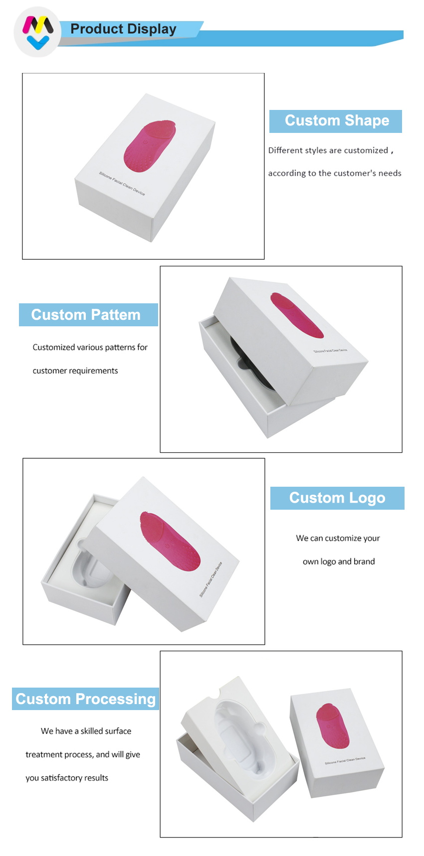 Hecho con papel de arte C2S de 157 g + cartón gris de 1200 g, inserte con cartón blanco bueno y duro y plástico que mantendrá los productos en su lugar.