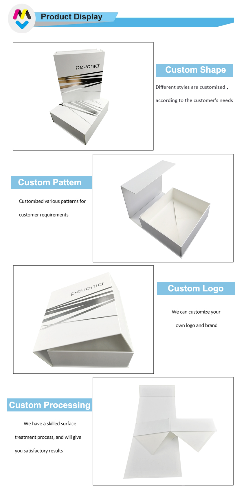 Caja de cartón plegable laminada brillante de alta calidad, fabricada con papel de arte recubierto + cartón gris con cierre magnético. Generalmente se utiliza para empaquetar zapatos, ropa y otros productos de consumo.
