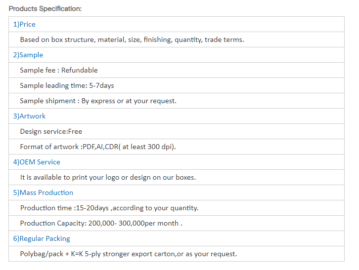 Tenga en cuenta que todas las imágenes de productos que publicamos en nuestra web son solo para su referencia sobre el tipo de embalaje que fabricamos, y no significa que vendamos el mismo producto en stock. Podemos personalizar cualquier tamaño, color, impresión o estructura de embalaje de papel.
