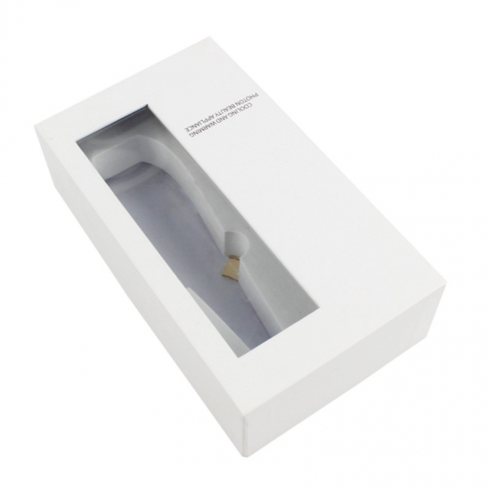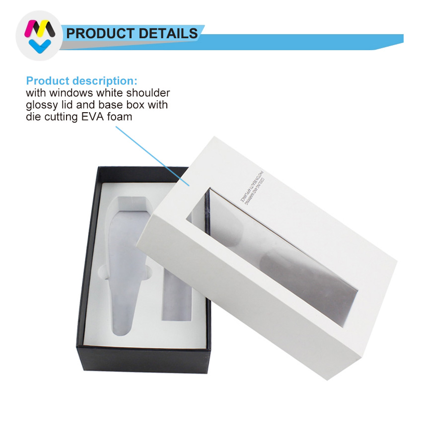 Esta es una ventana de PVC. cajas de cartón blanco con tapa lo cual hizo por papel de arte C2S de 157 g + tablero gris de 1200 g, inserte el relleno de EVA blanco que se adapta al tamaño de los productos dentro de la caja.