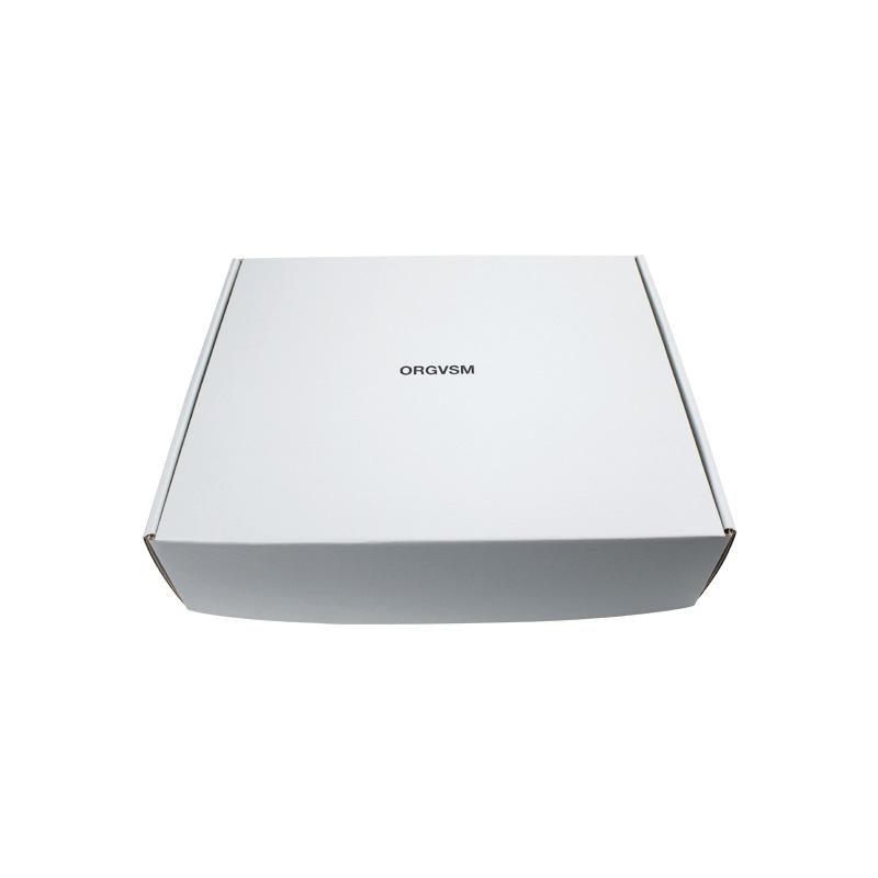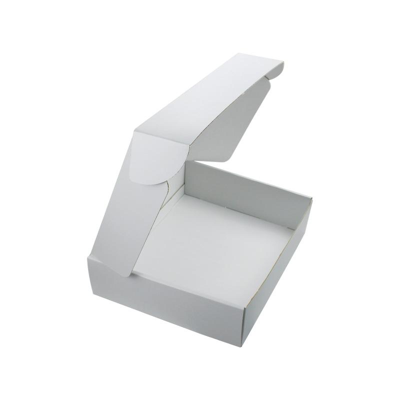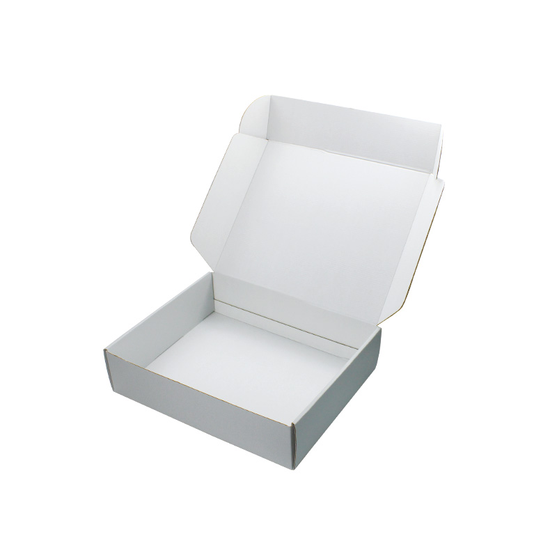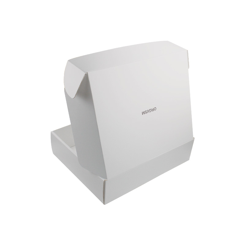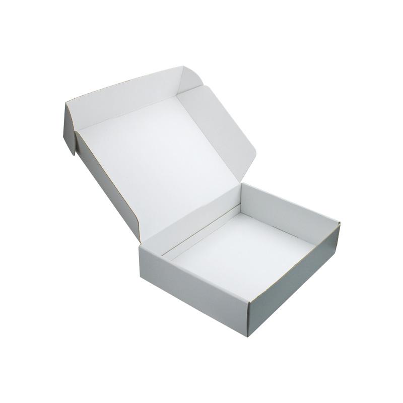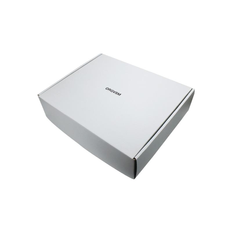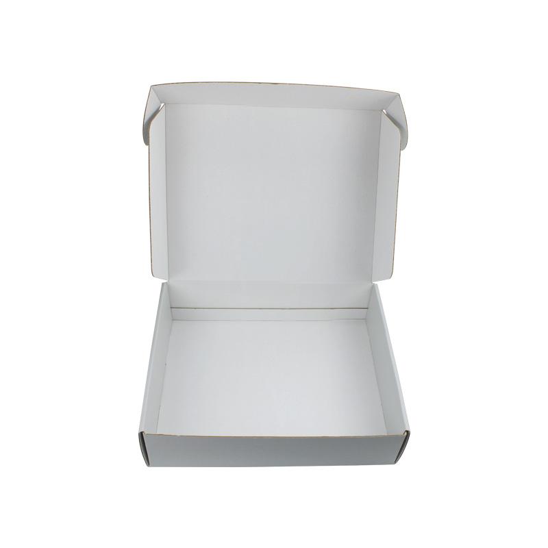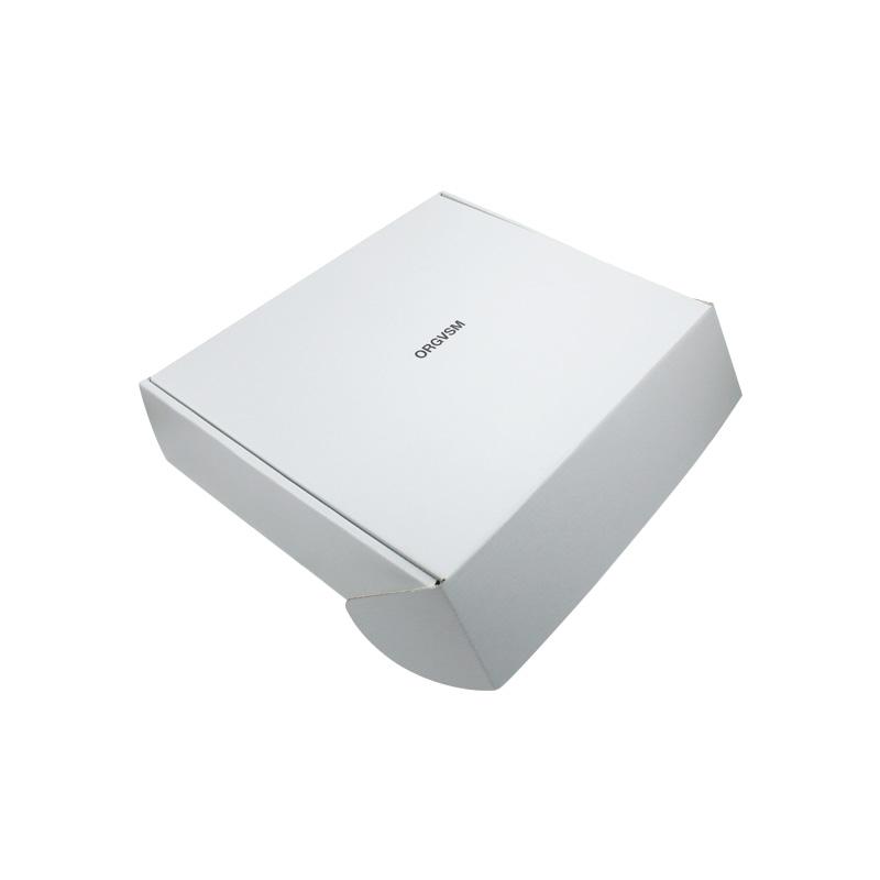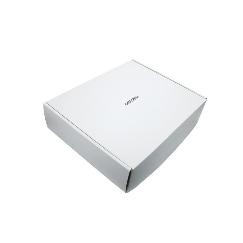 Este es un cajas de embalaje de cartón corrugado blanco que está hecho con flauta CCNB + WE de 250 g, es un estilo sencillo de caja postal que por dentro y por fuera es de color blanco liso, con logotipo personalizado en la tapa superior con acabado mate.