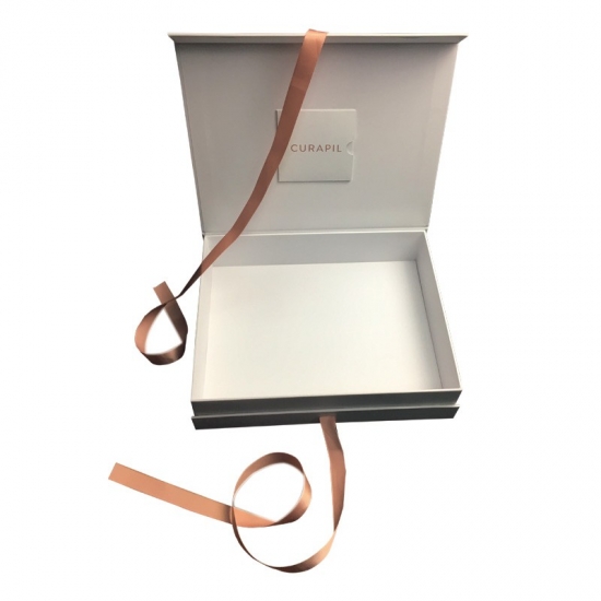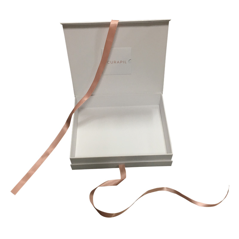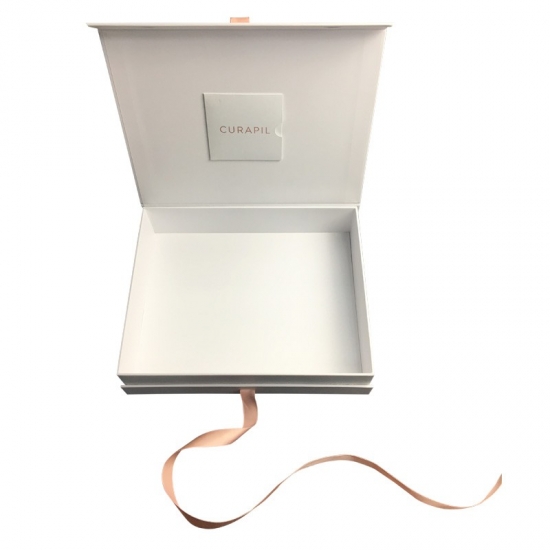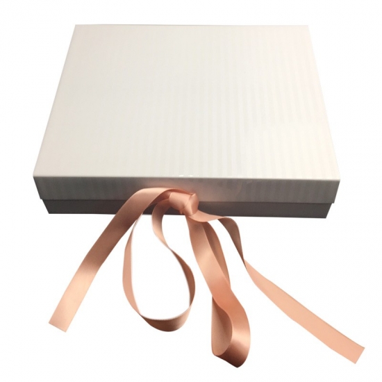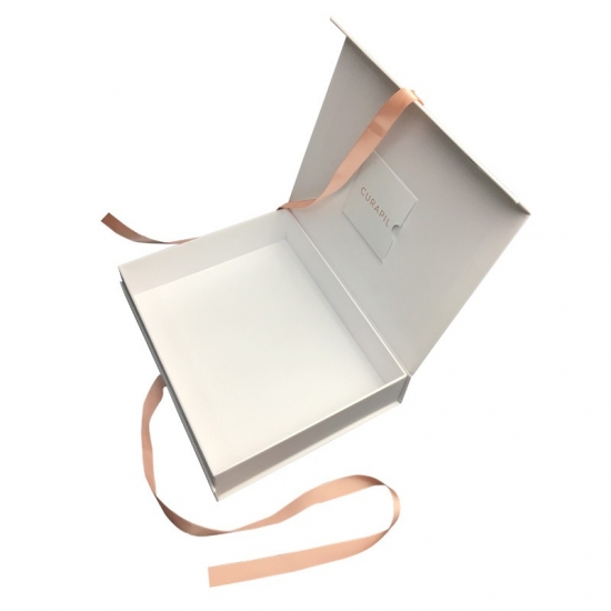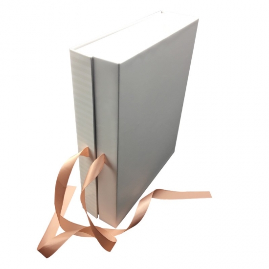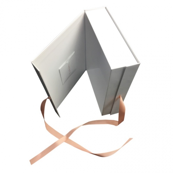 Este es un blanco caja de regalo magnética con cinta lo cual hizo por papel de arte C2S de 157 g + tablero gris de 2 mm, el exterior de la caja está lleno de protección UV que le da a la caja un aspecto brillante y lujoso, dentro de la tapa hay un pequeño sobre adjunto para insertar la tarjeta.