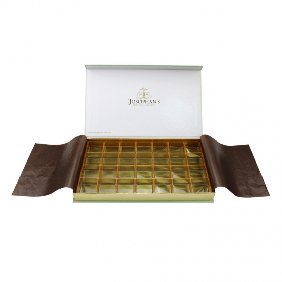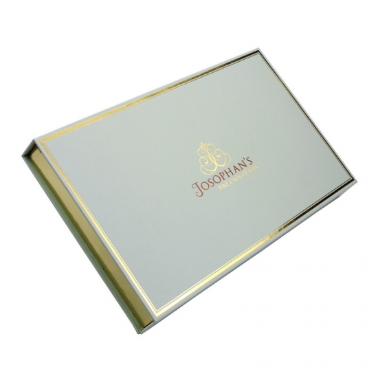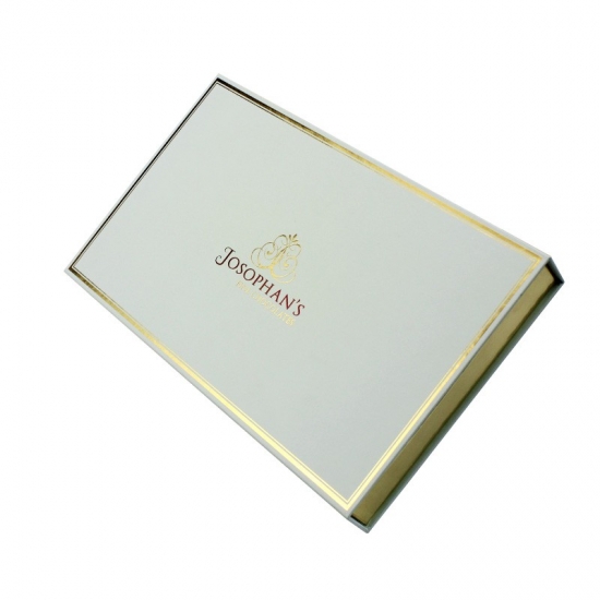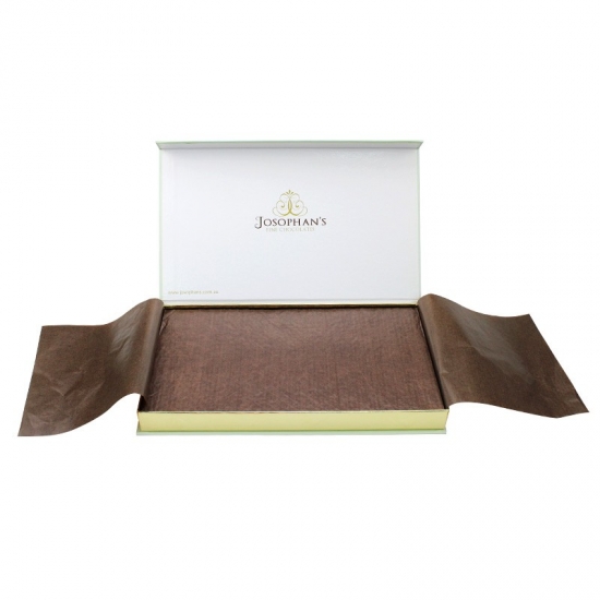 Cajas de regalo de chocolate verde con tapa abatible y cierre magnético. De apariencia blanca y sencilla, con bandeja de plástico y papel para fotocopias. Lujo discreto, económico y elegante. Ideales para todo tipo de embalajes de chocolate.