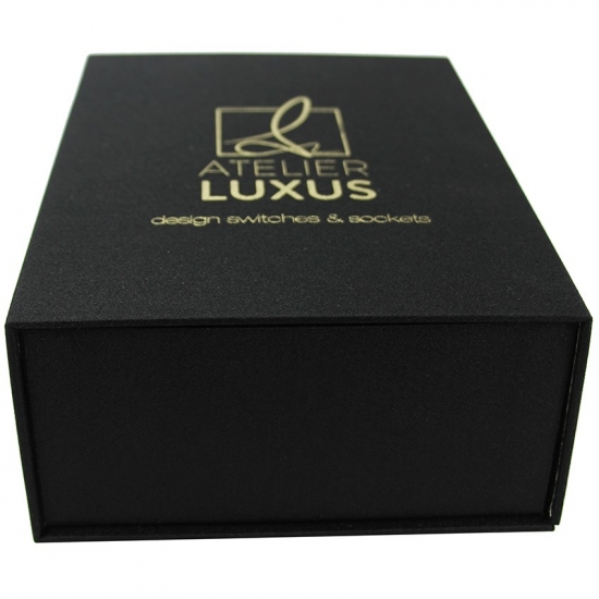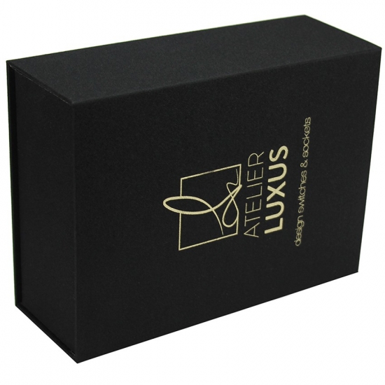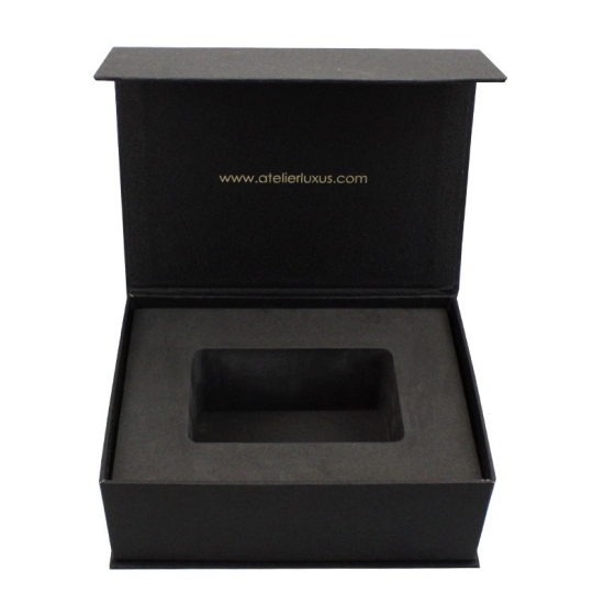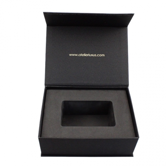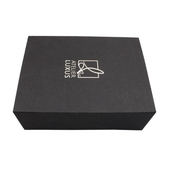 La caja de regalo con tapa negra está hecha de papel artístico C2S de 157 g/m² laminado con cartón gris de 2 mm con soporte de espuma EVA, personalizada en cualquier tamaño, color y logotipo. El acabado de la superficie fue laminado mate con estampado en caliente. Tamaño 21*15,5*7,5 cm
